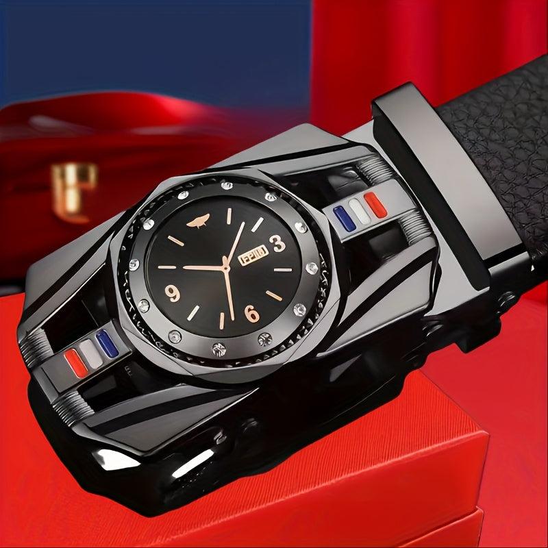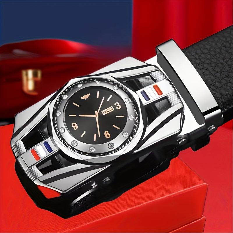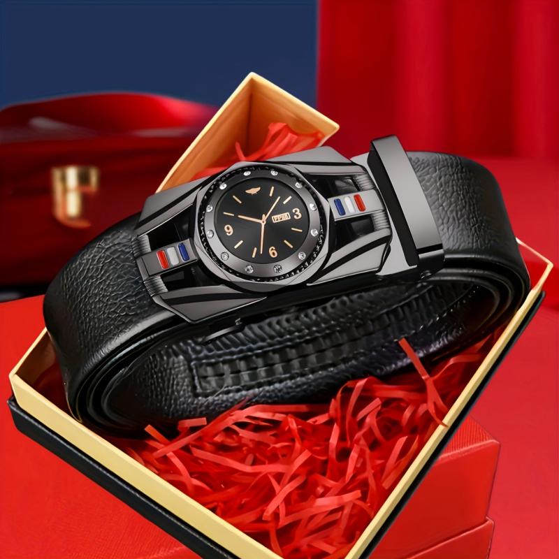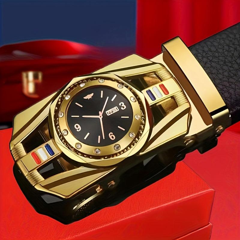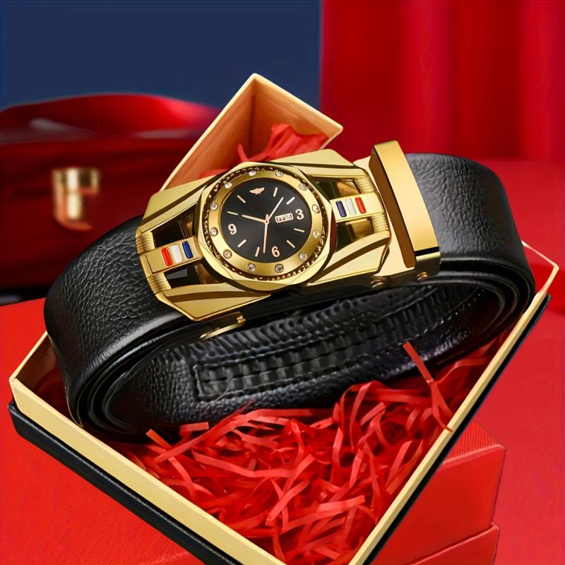 Elevate your style with this stylish belt featuring a golden tone automatic buckle and embossed faux leather design. Perfect holiday gift for business or casual wear.