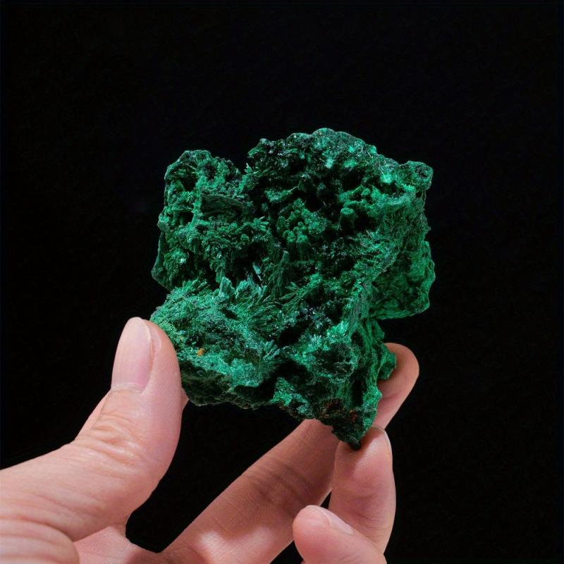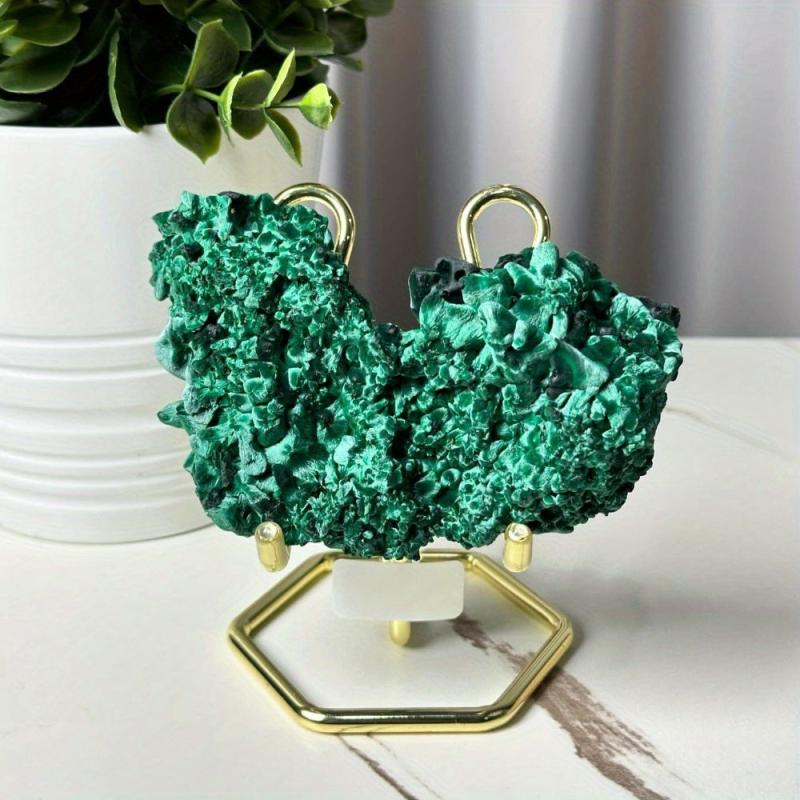 Explore the beauty of this Malachite raw specimen showcasing vibrant Chrysocolla crystal cluster with unique inclusions. Display it with the hexagonal golden tone stand for a bohemian touch.