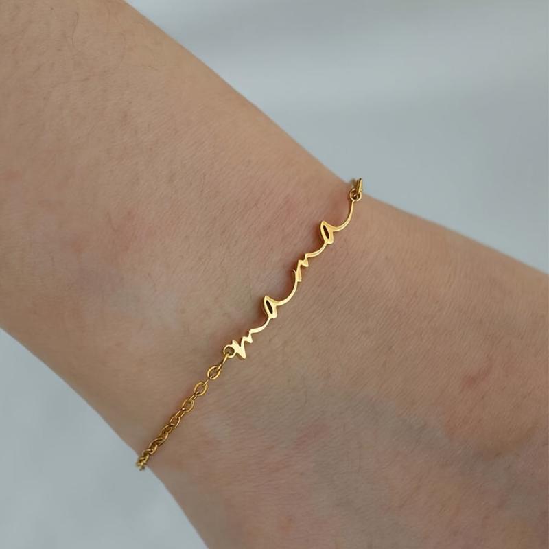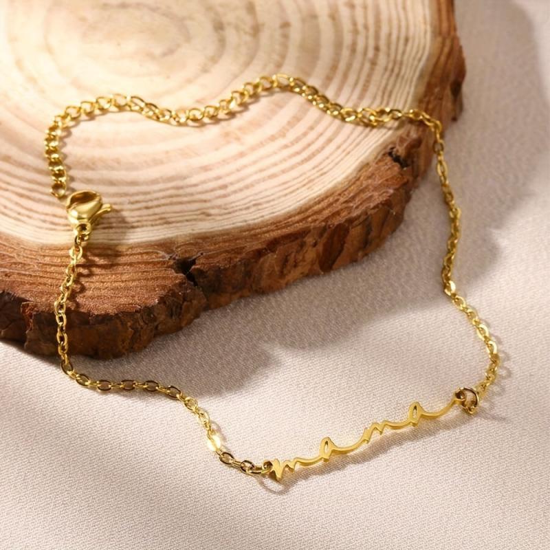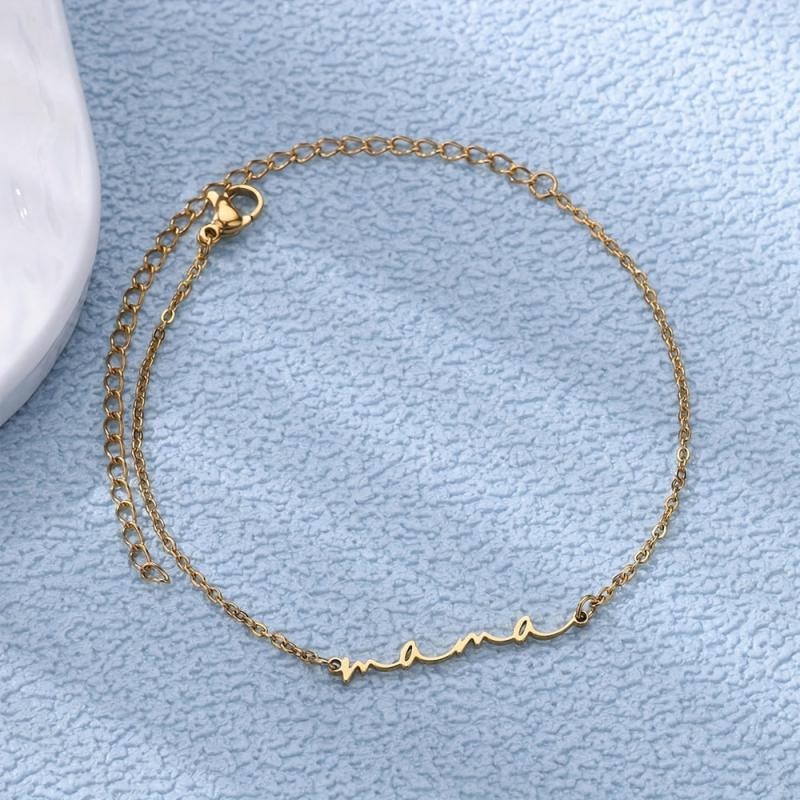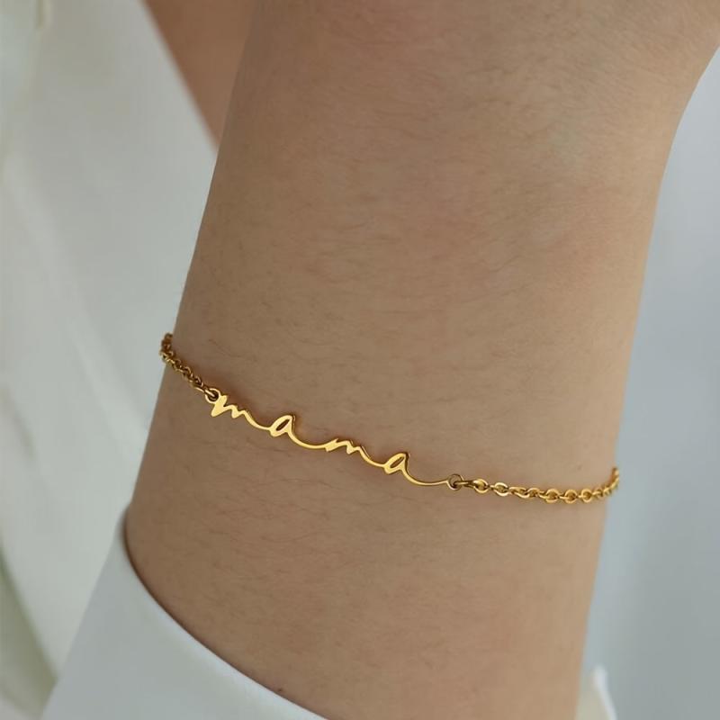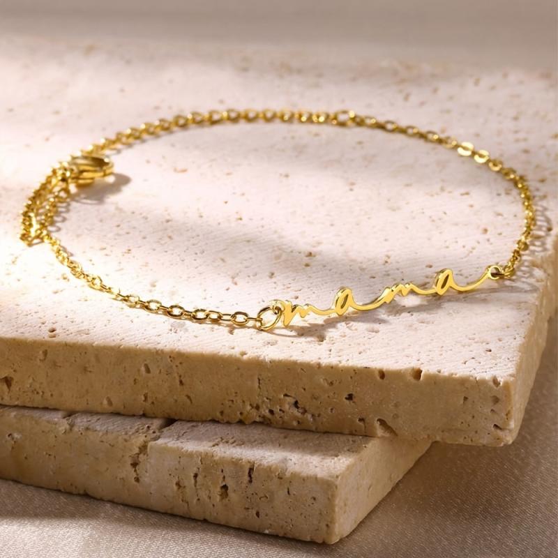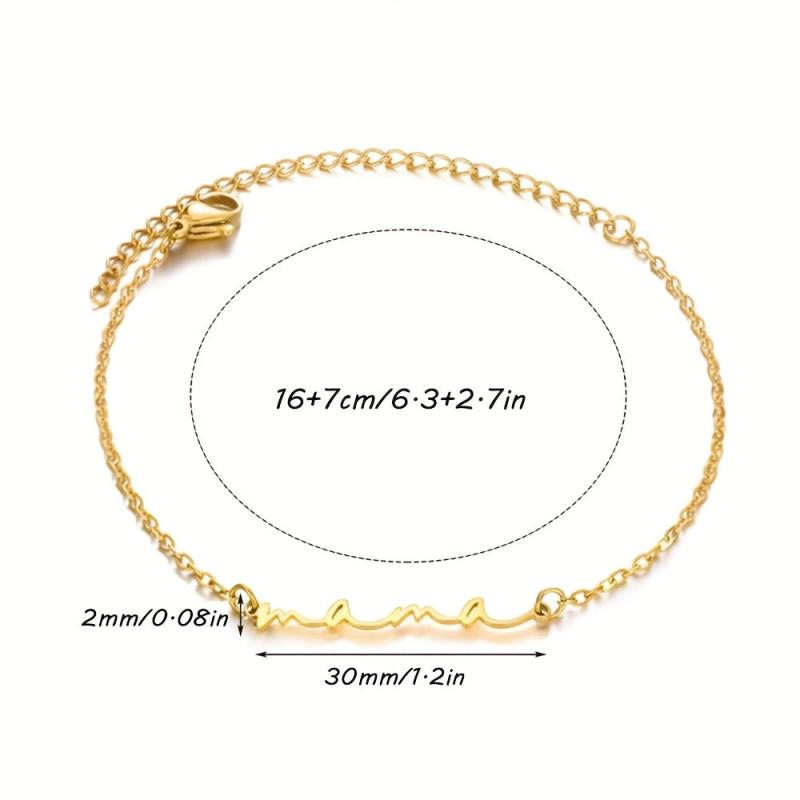 This delicate golden tone stainless steel bracelet with 'Mama' lettering is the perfect gift for mom. It's an everyday accessory that exudes elegance and style.
