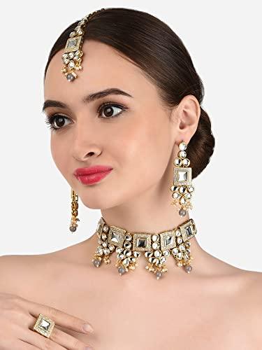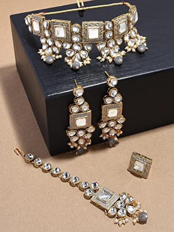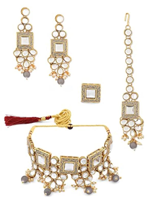 Exquisite Meenakari Kundan choker necklace set with earrings, maangtikka, and ring. Perfect for special occasions and weddings.