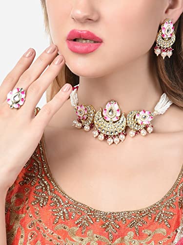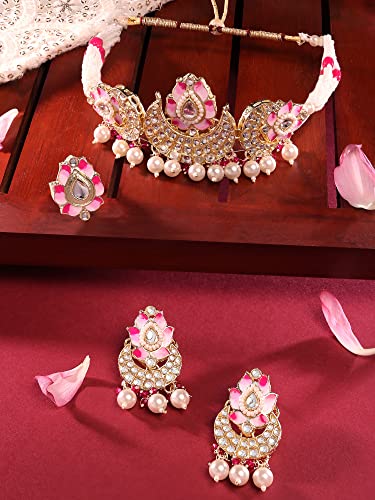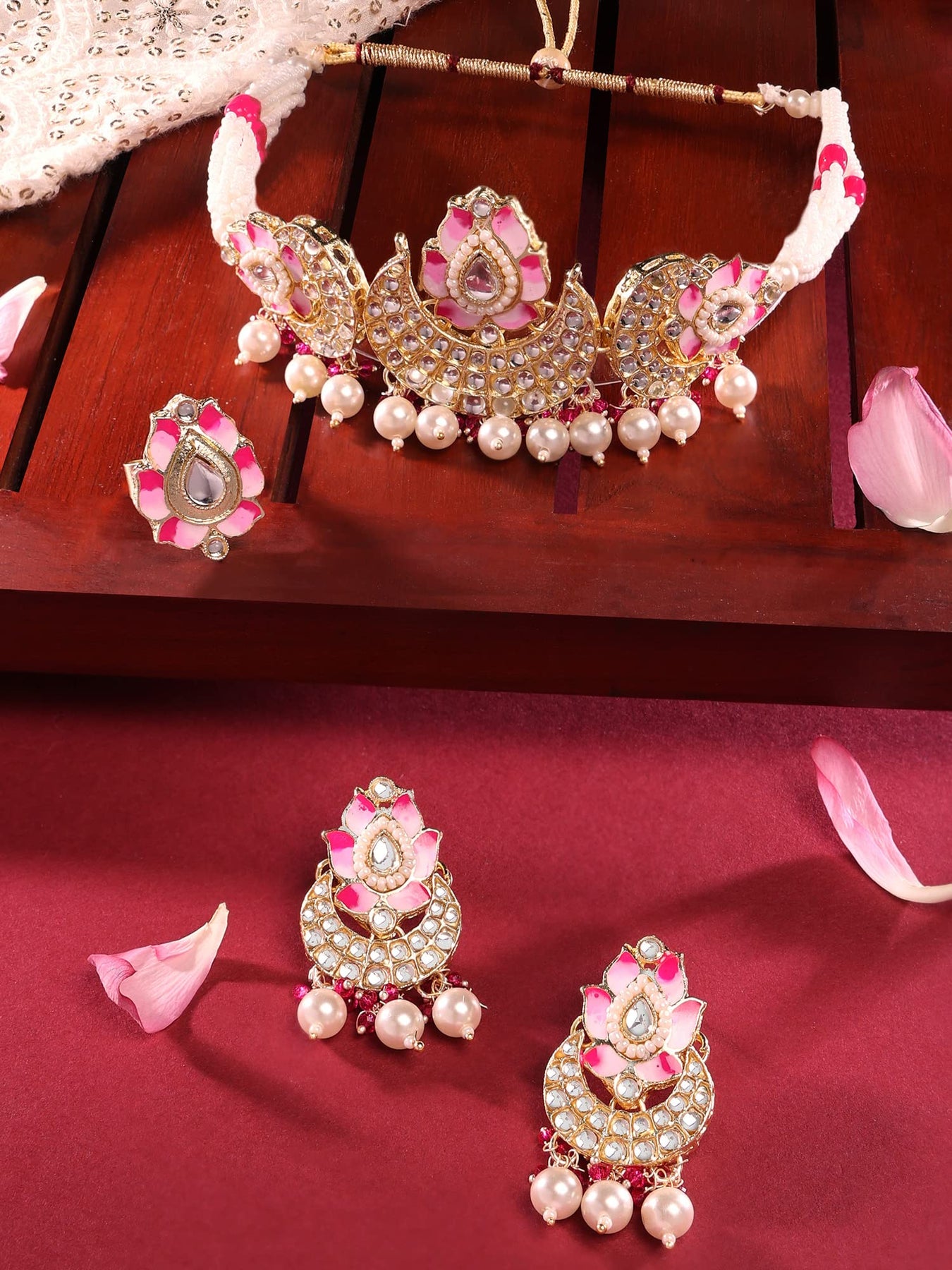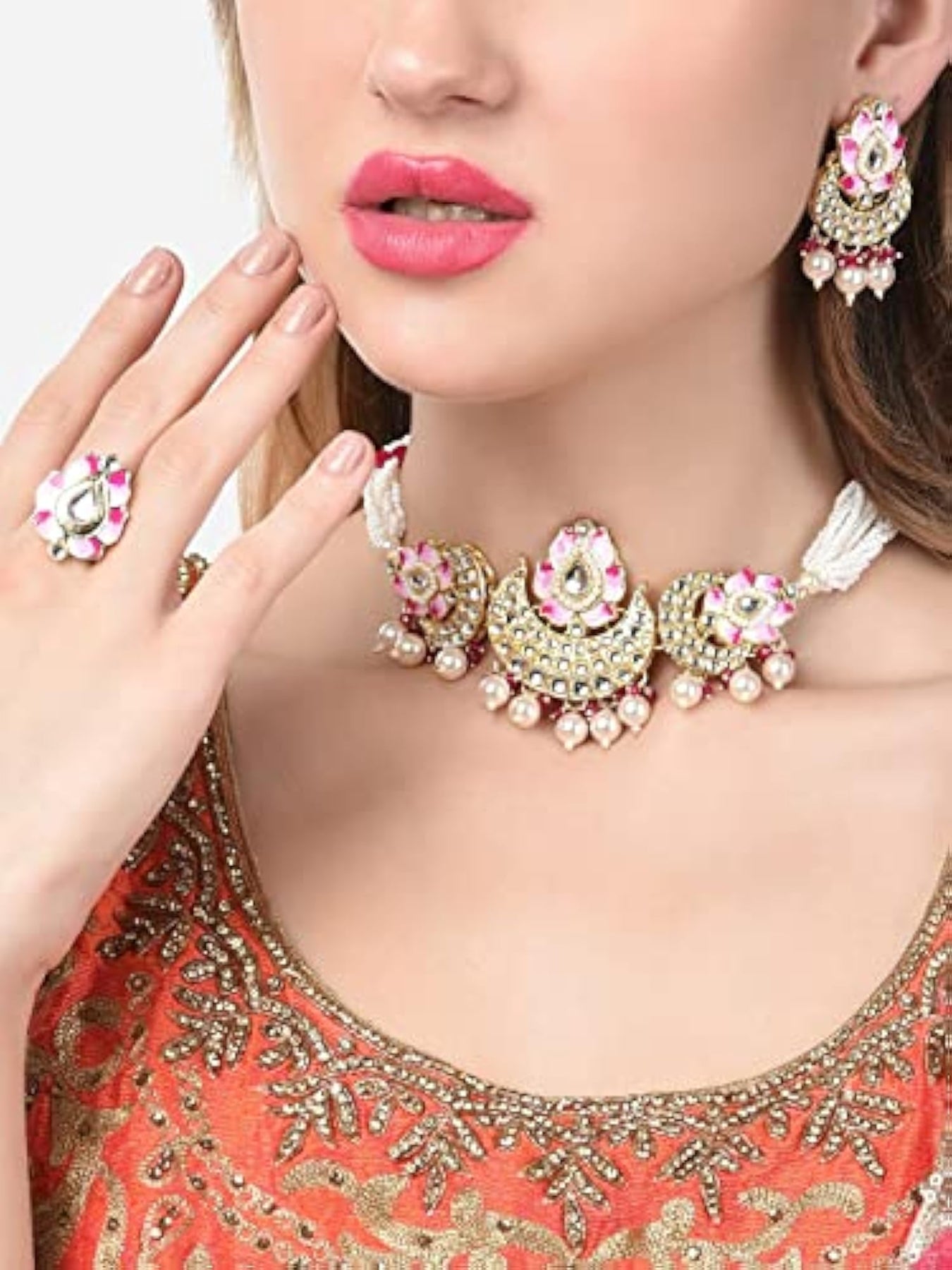 Add a touch of elegance with this exquisite Meenakari Lotus Crescent Kundan & Beads Choker Necklace Set. Perfect for special occasions.