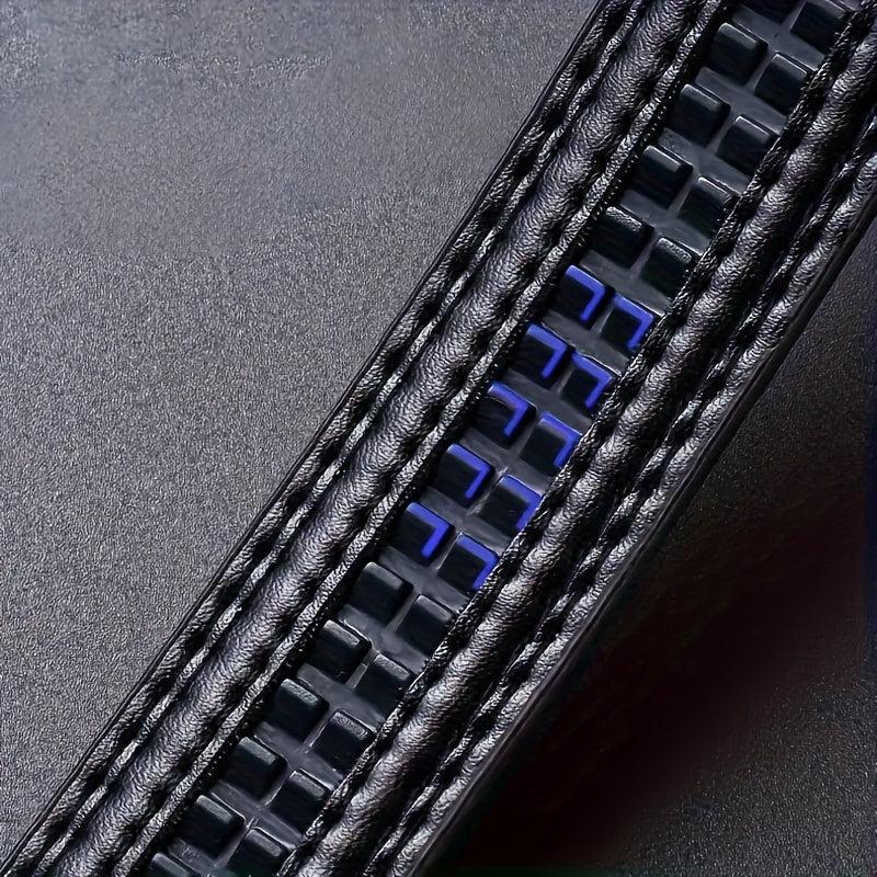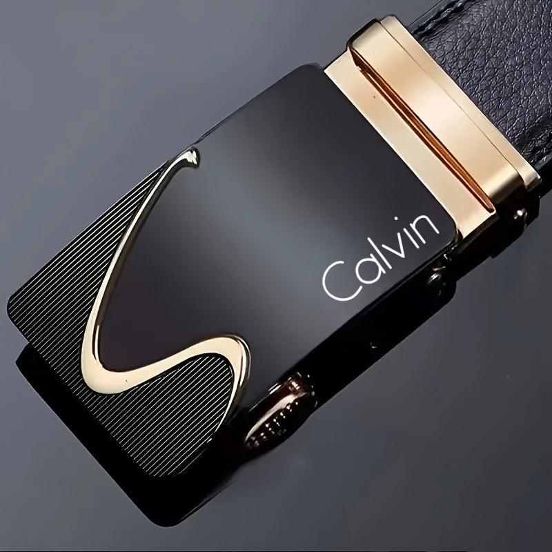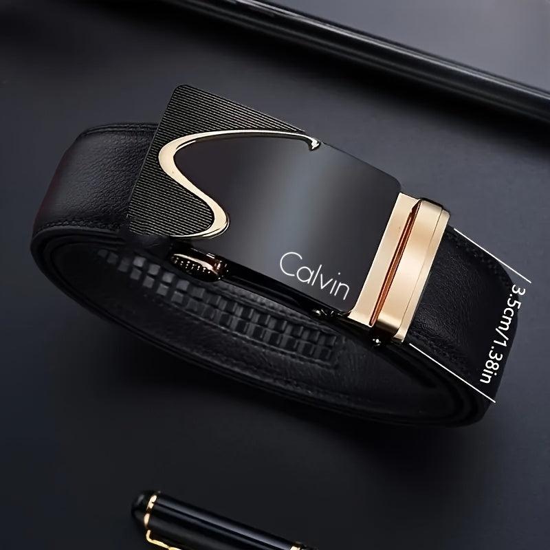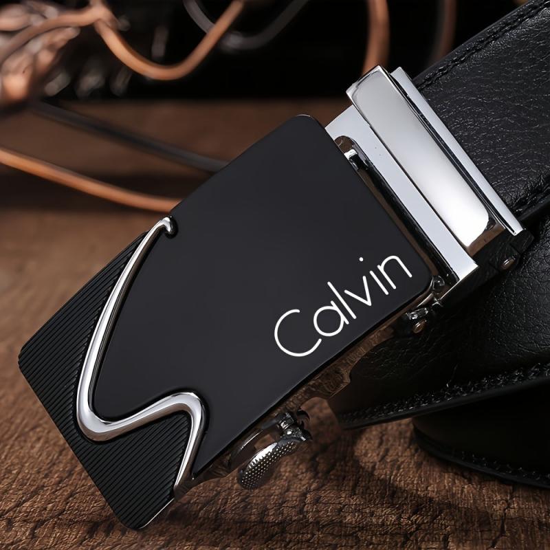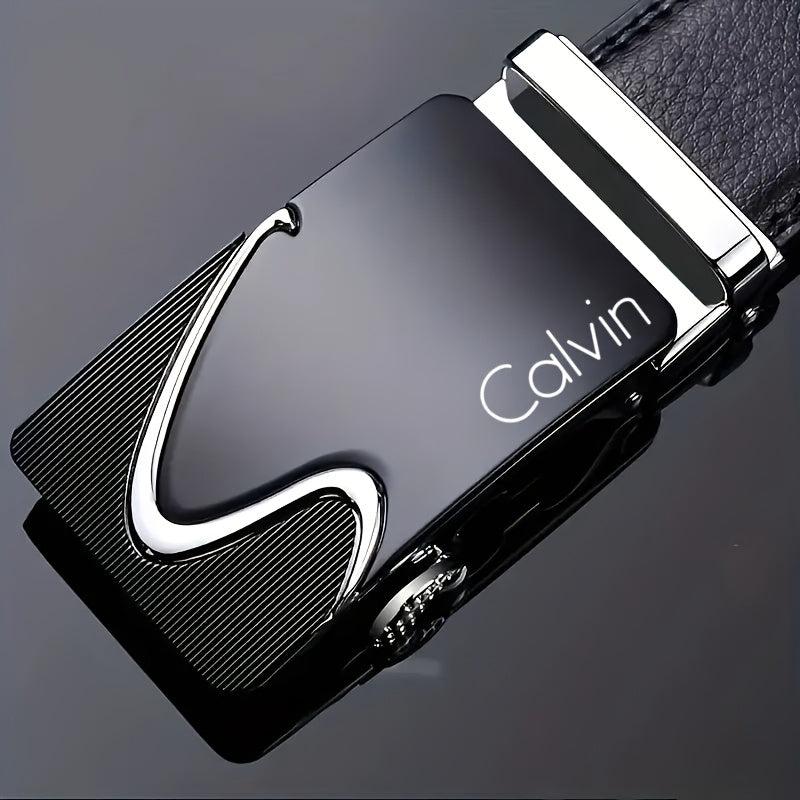 Elevate your style with this sleek ratchet belt featuring 'CALVIN' lettering and a modern 'S' detail automatic buckle. Perfect for business attire or casual looks. Makes a great gift for any occasion.