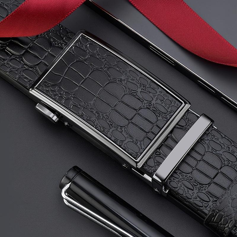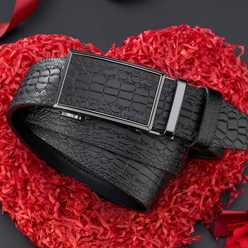 Stylish crocodile pattern leather belt with automatic alloy buckle, perfect for business and casual wear. This embossed leather belt is durable and versatile.
