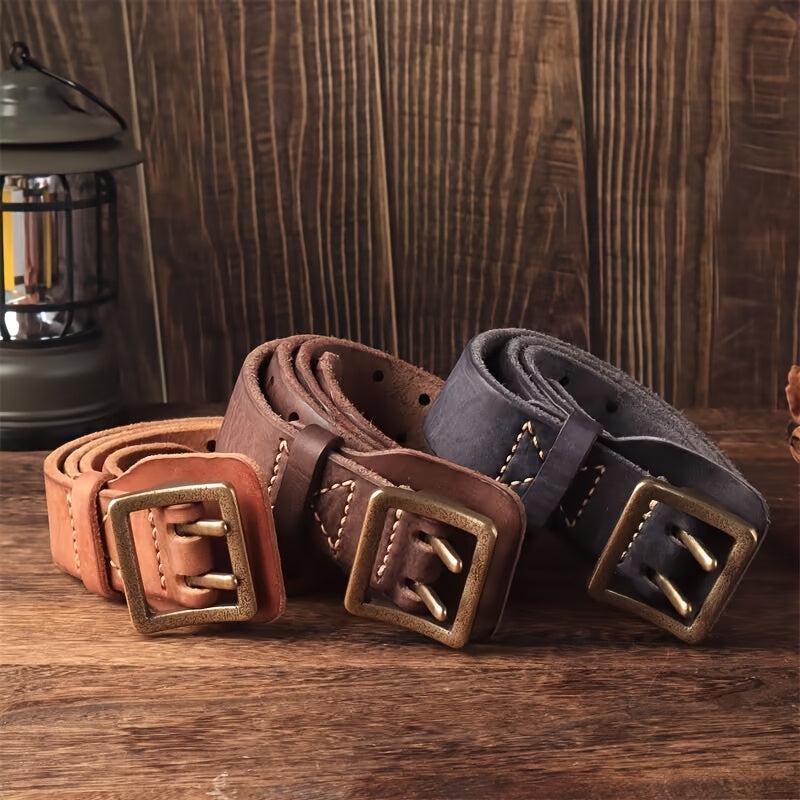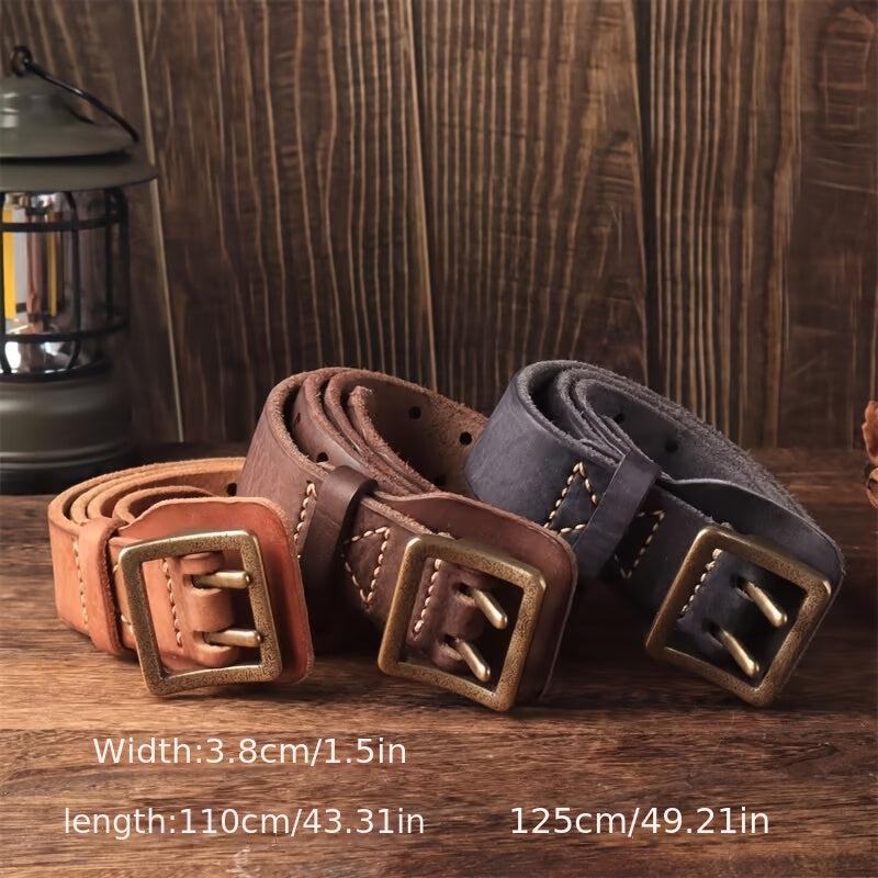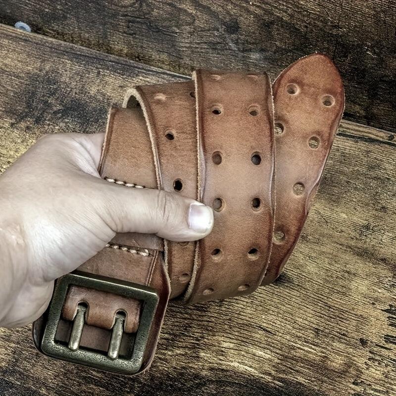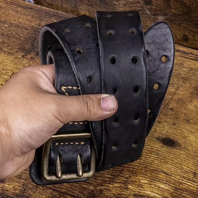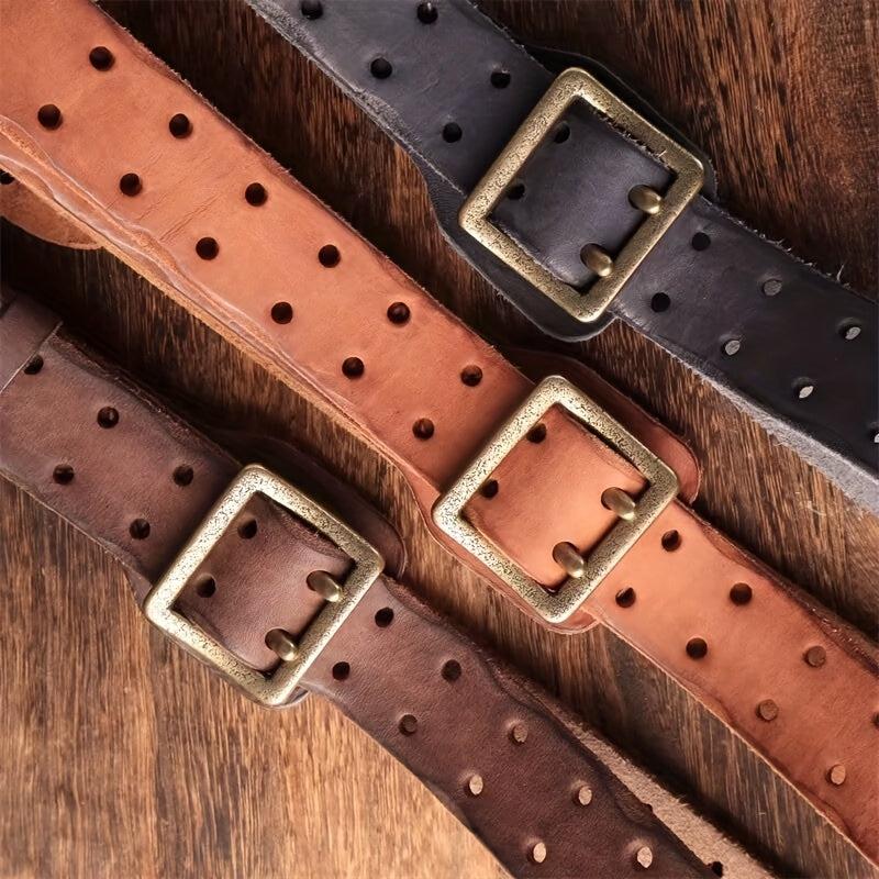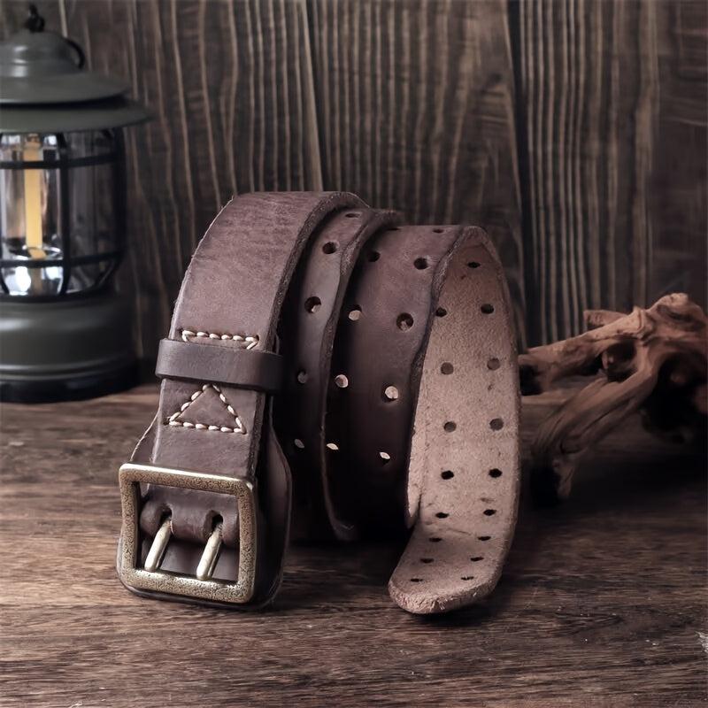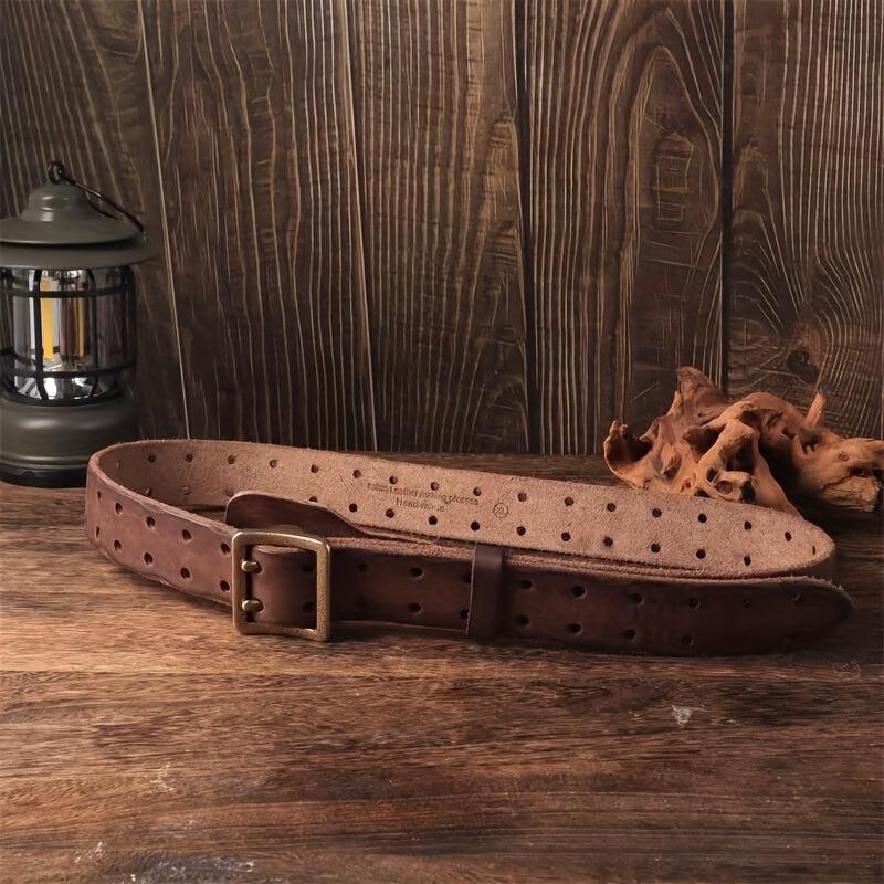 This durable and sturdy belt features a square copper buckle, decorative stitching, and a full hole pattern. Ideal for casual and formal wear.