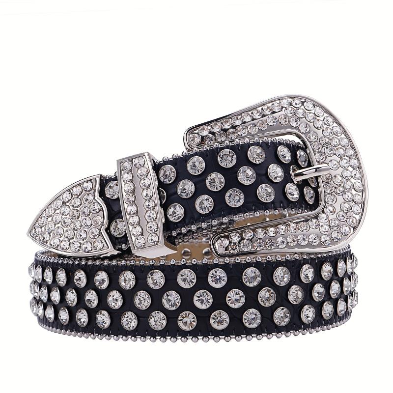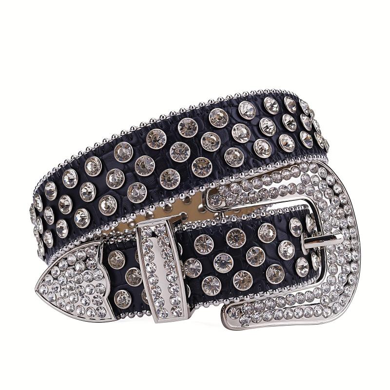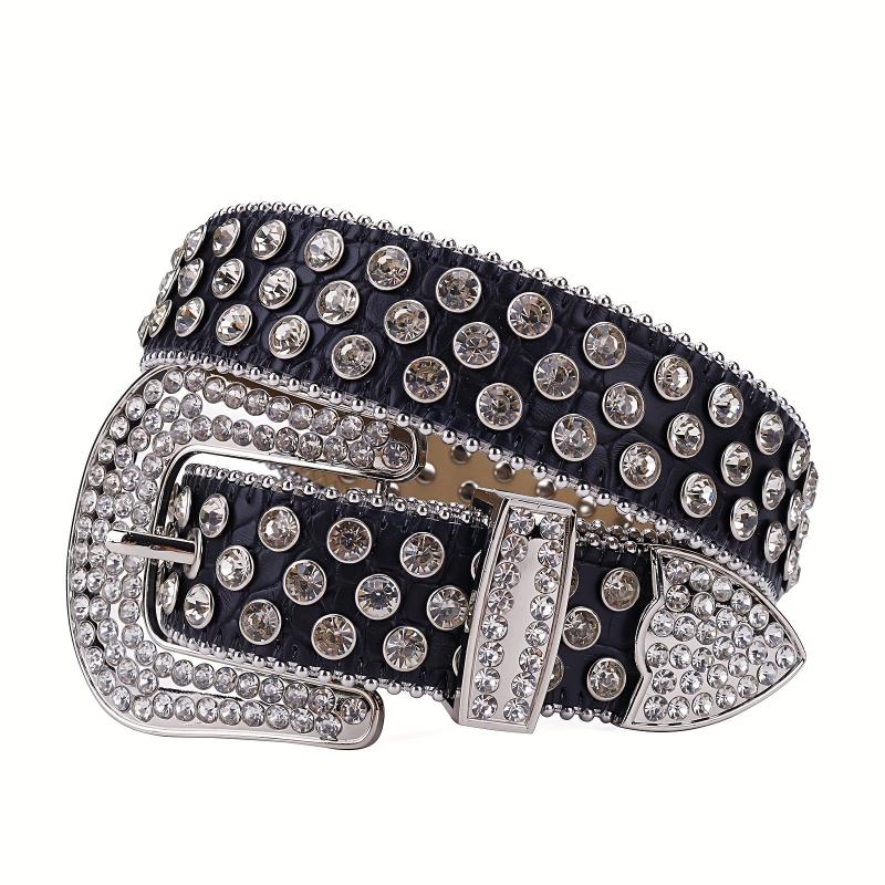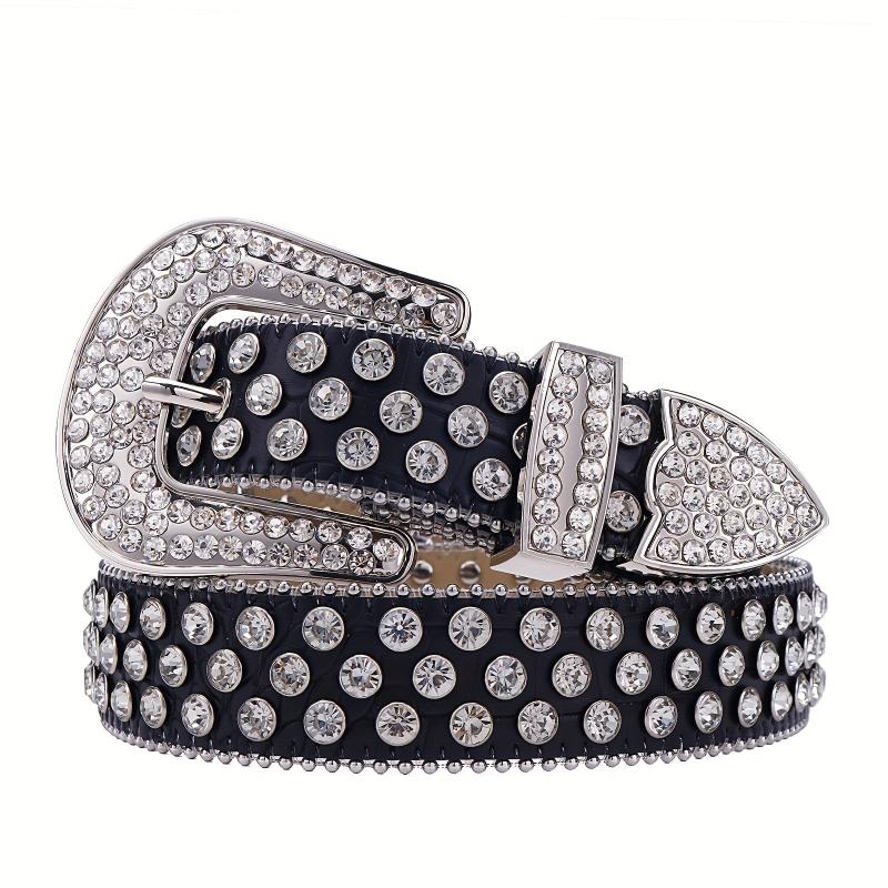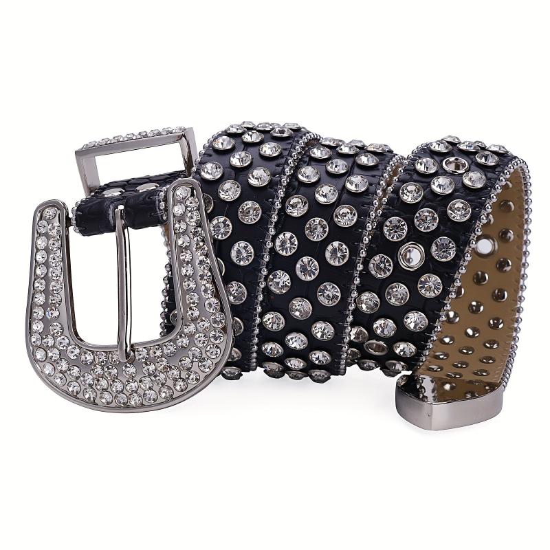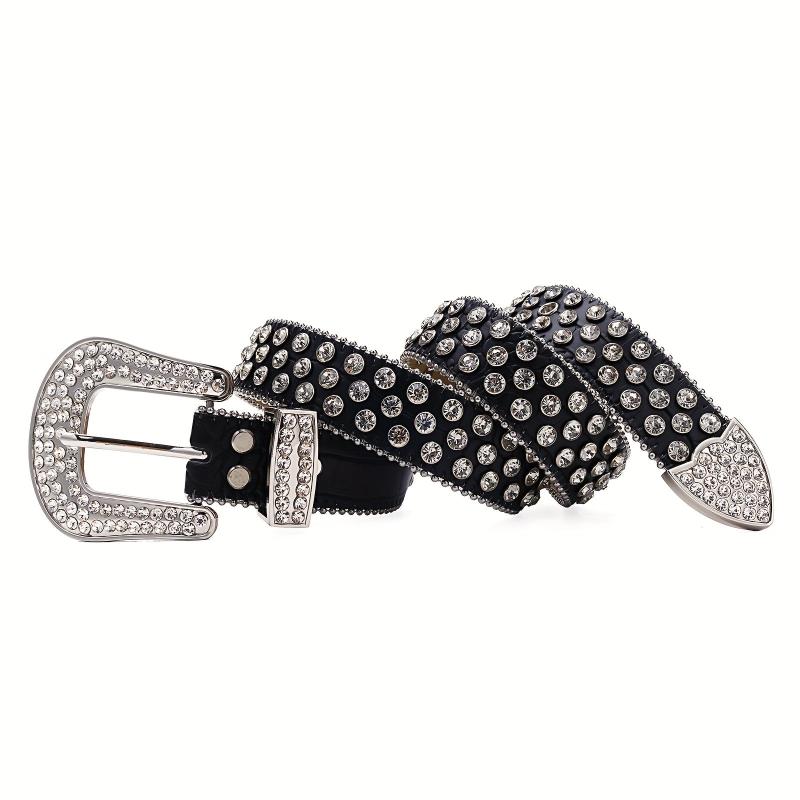 This stylish faux leather belt with rhinestones is ideal for the holiday season, adding a touch of glam to any outfit.