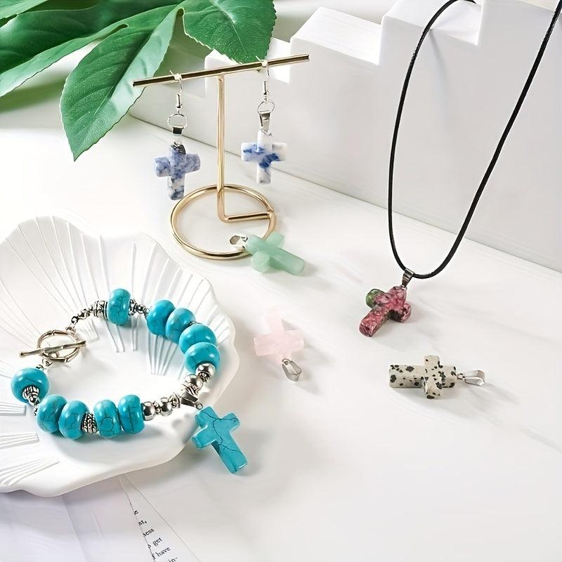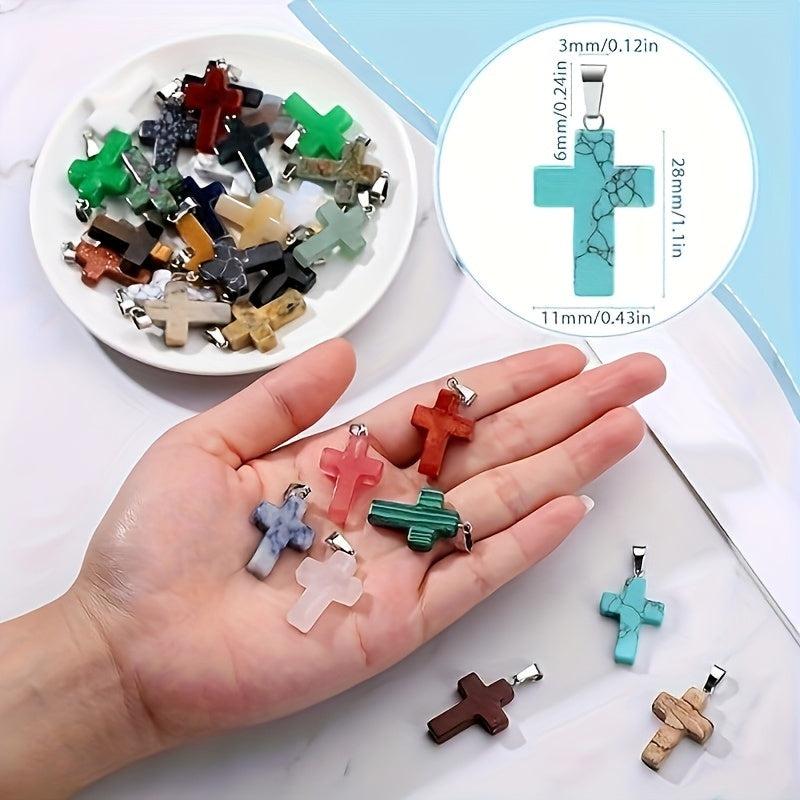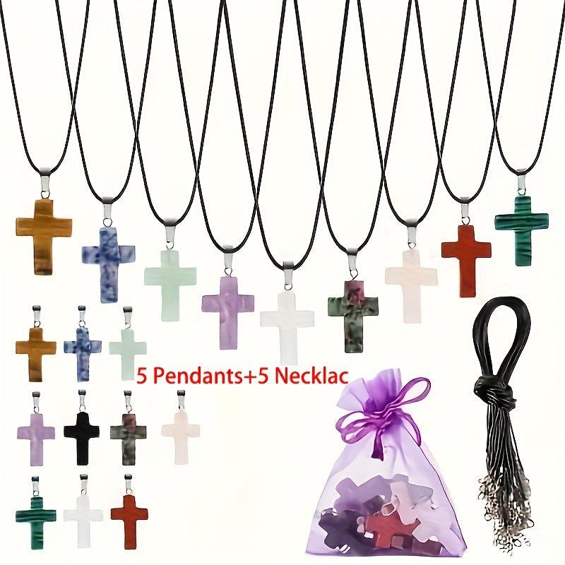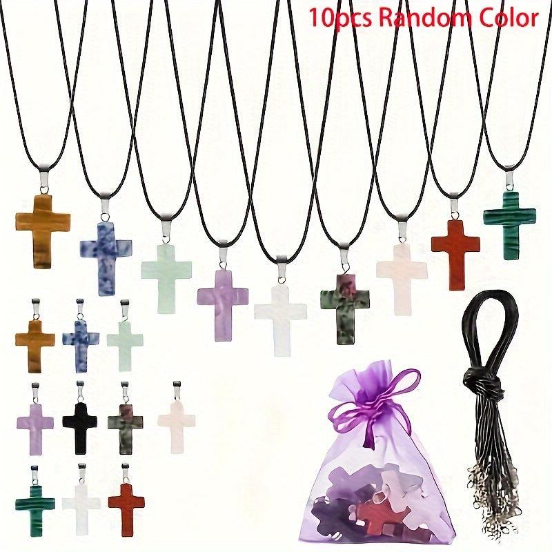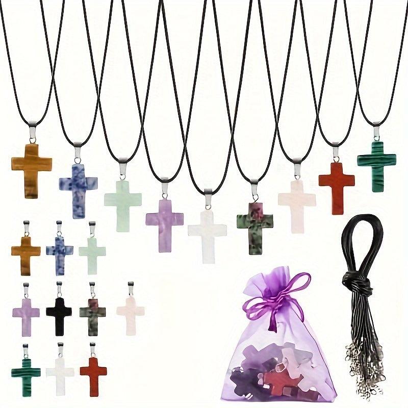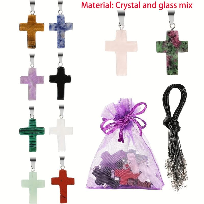 Get a set of 10 or 20 multicolor cross-shaped crystal pendants made of faux quartz glass. Each pendant comes with an adjustable chain and a purple pouch.