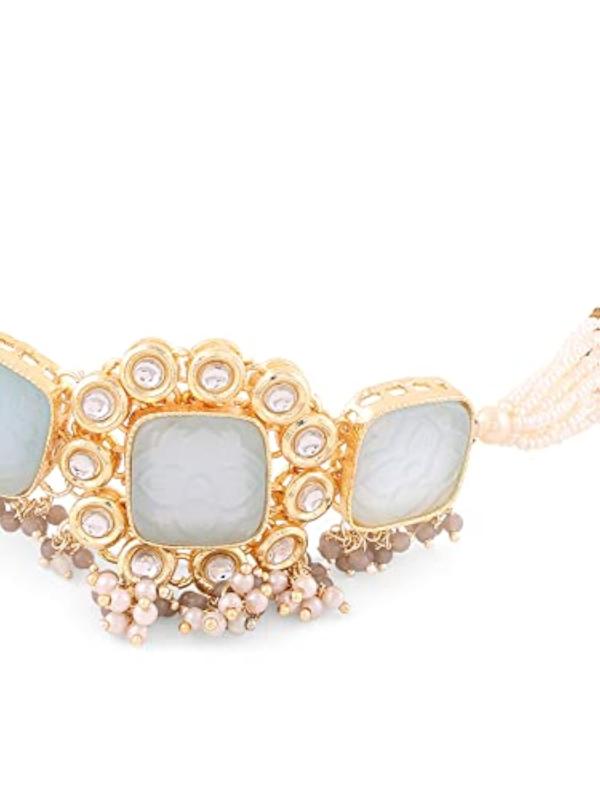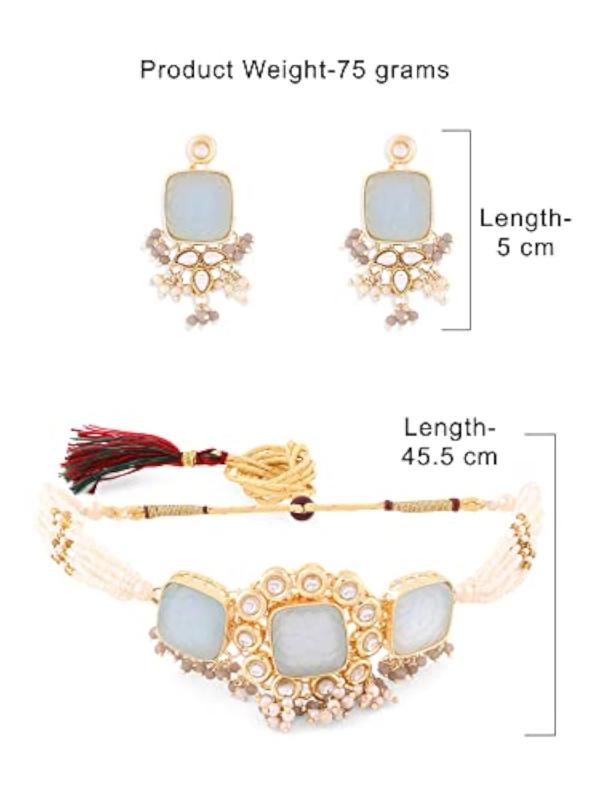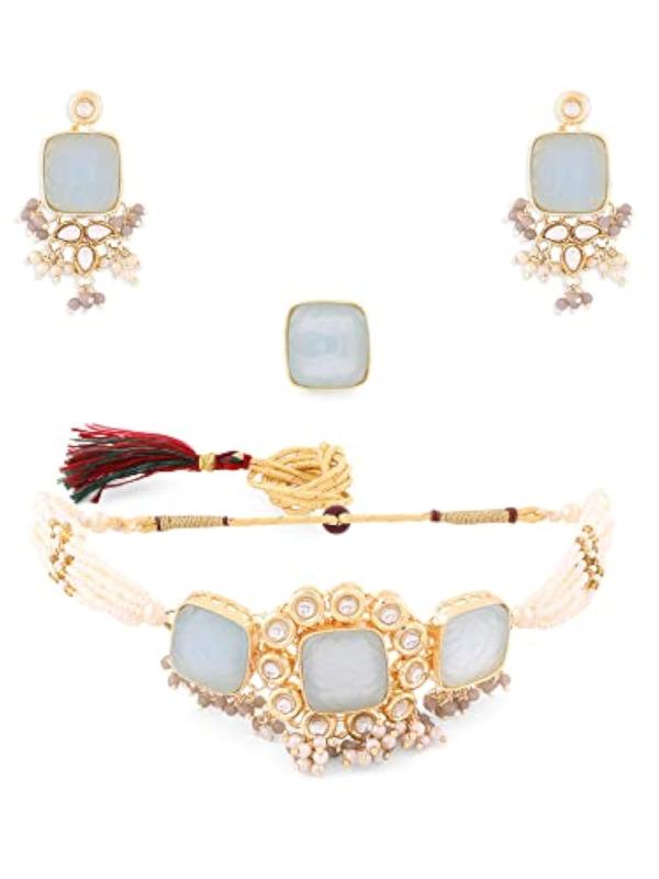 Elegant multistrand choker necklace set with stones and beads. Includes matching earrings and ring. Perfect for women who love a touch of sophistication.