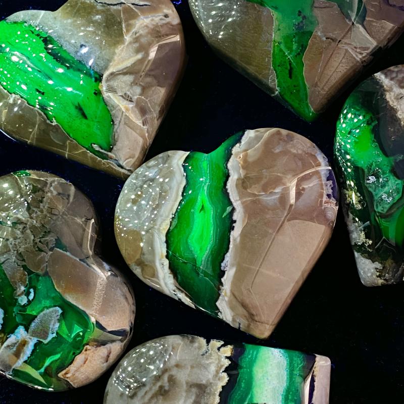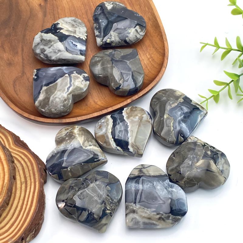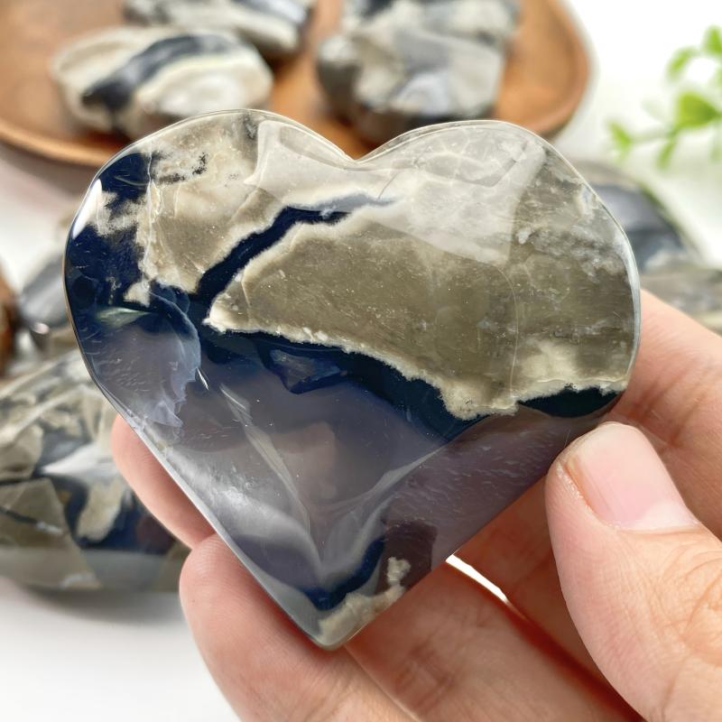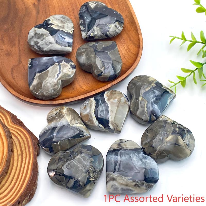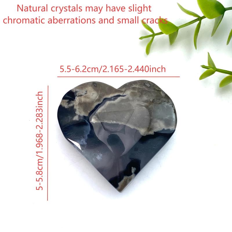 This unique natural Huoshan Agate heart stone features a mesmerizing fluorescent quality that makes it a perfect accent piece for your home decor. It is a collectible item that adds a touch of natural beauty to any space.