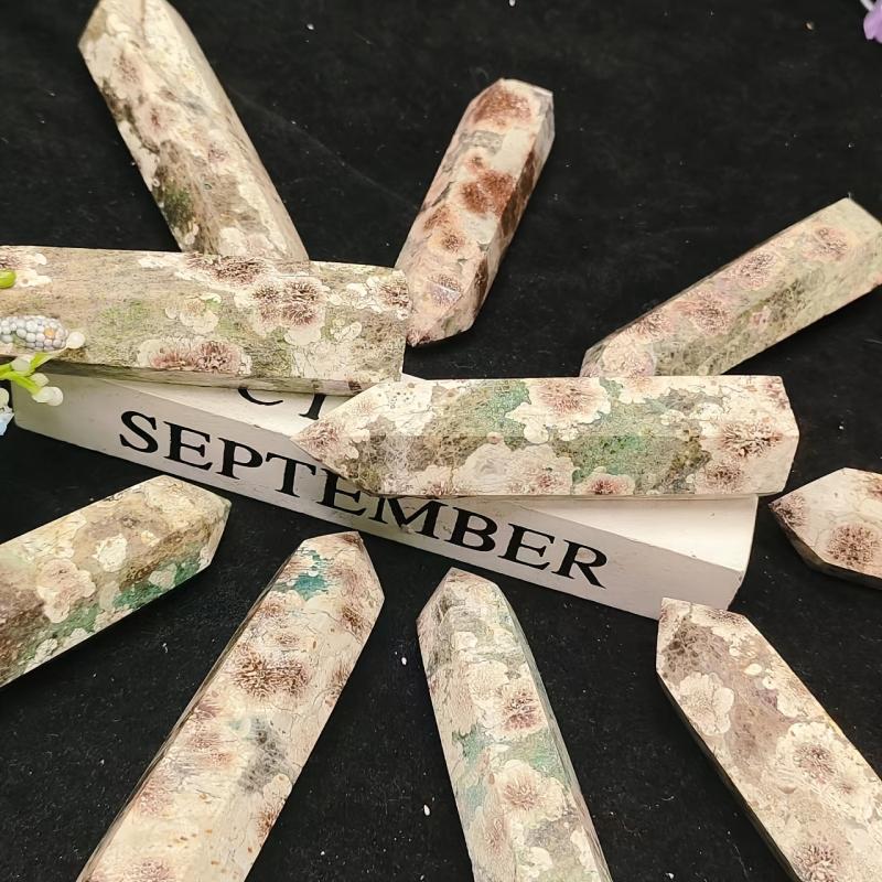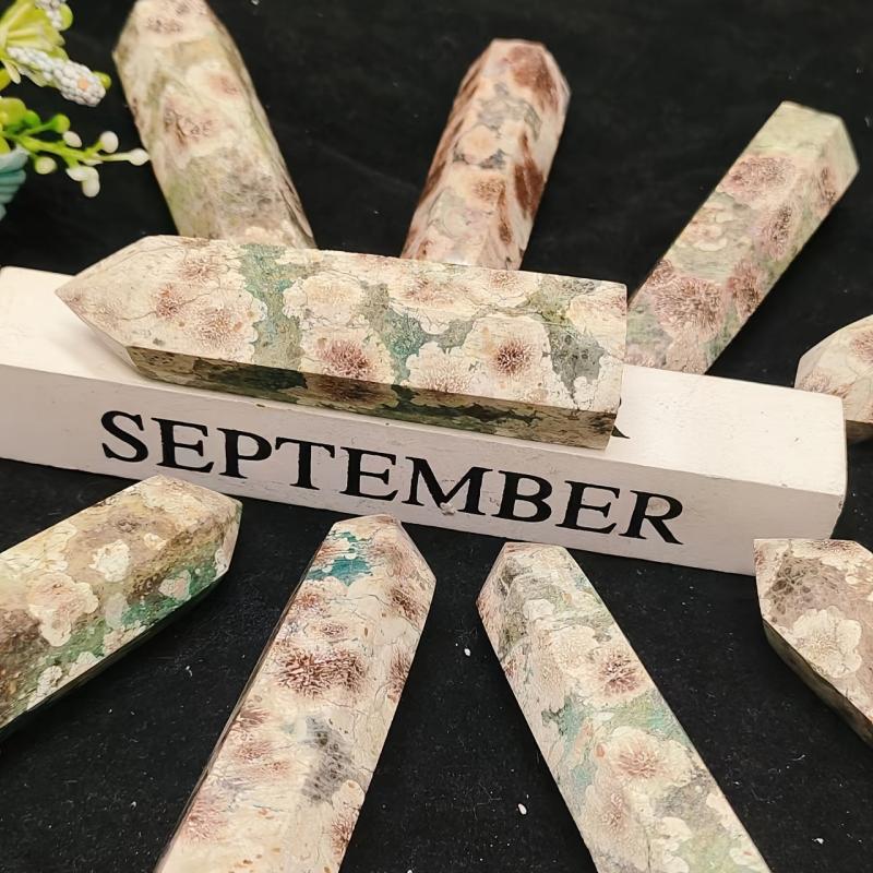 Beautiful green blossom agate tower with floral pattern, perfect for meditation, home decor, and DIY jewelry making. Also makes a great September birthstone gift.