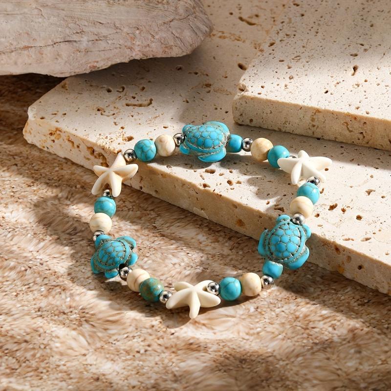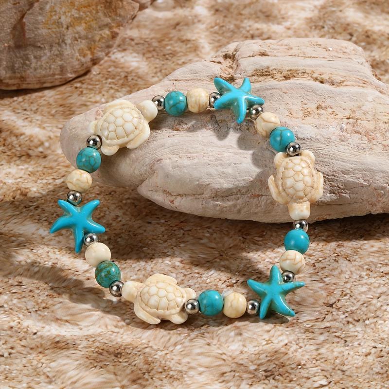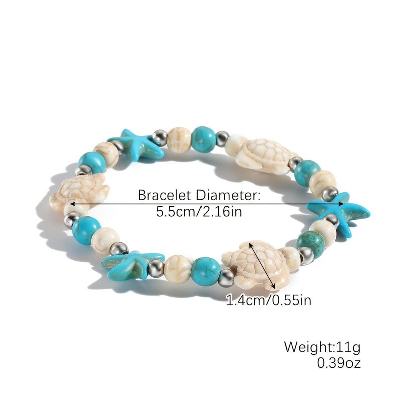 Add a touch of beachy charm to your outfit with this acrylic beaded bracelet featuring ocean-themed turtle and starfish charms. The turquoise color adds a pop of color to any look.