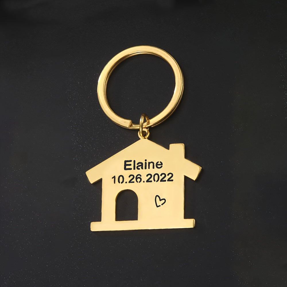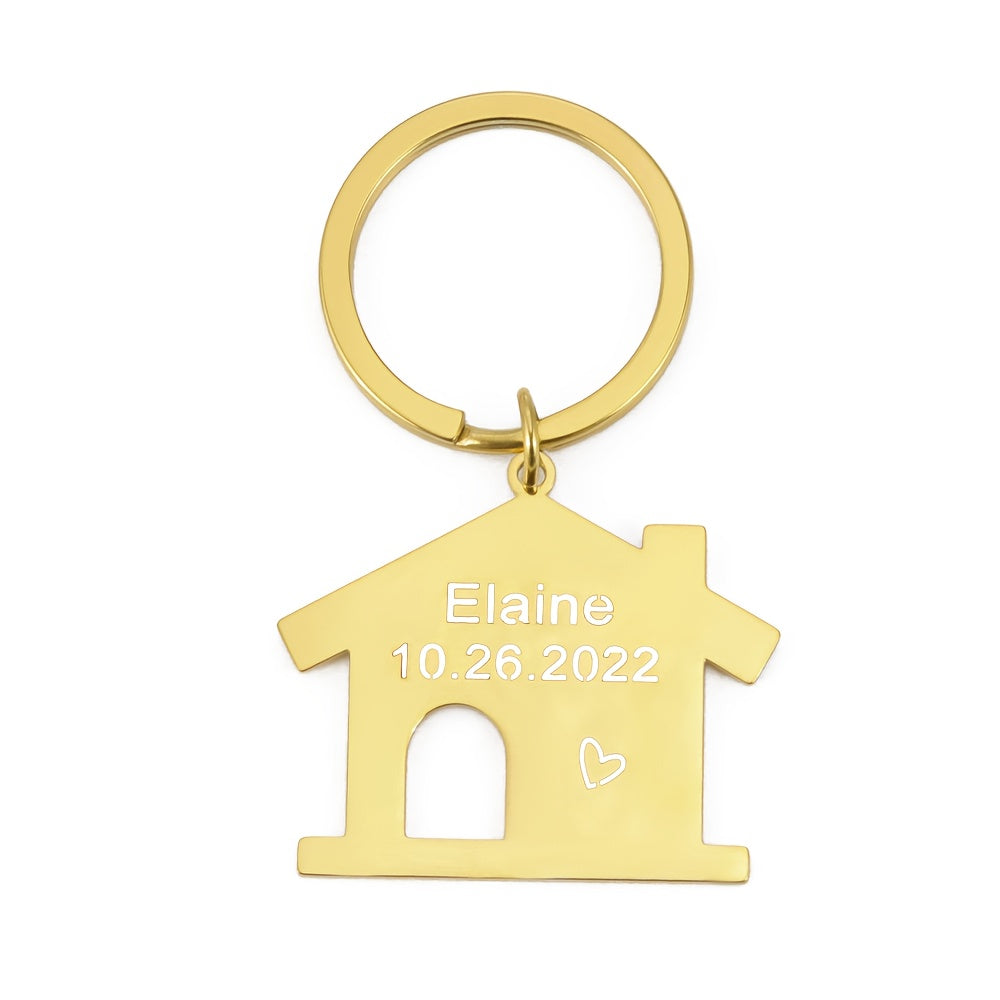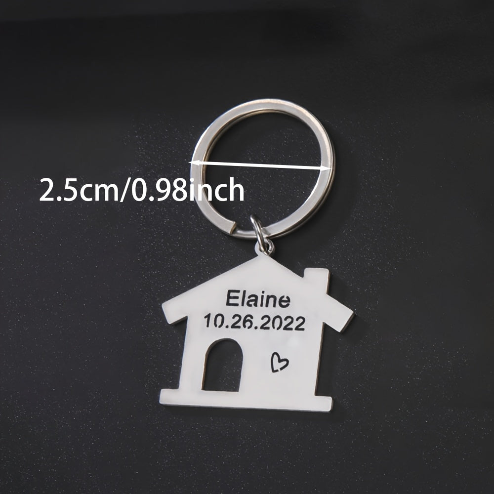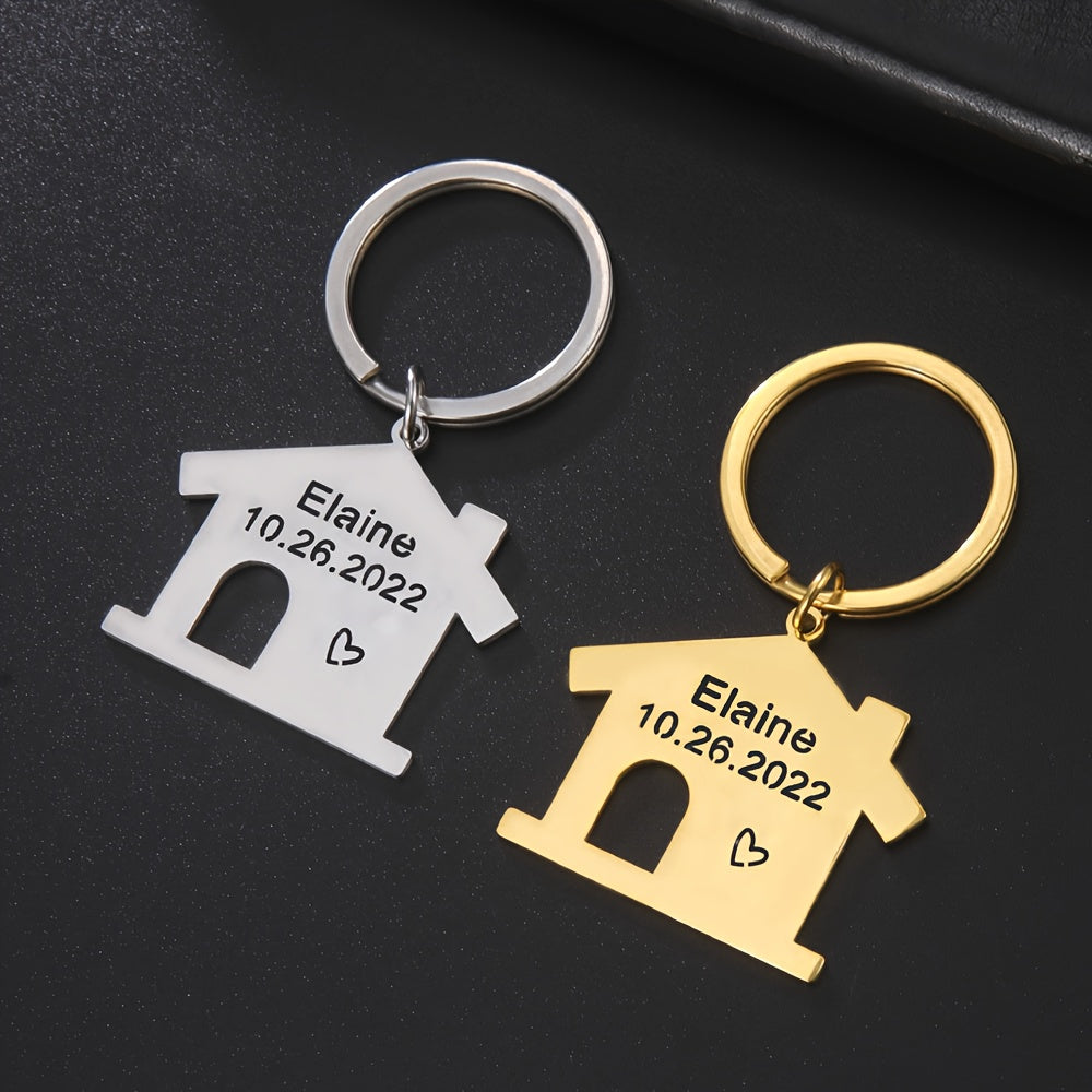 Fashionable DIY lettering key ring made of stainless steel in a house-shaped design. Custom engraving with a name and date makes it a perfect Christmas gift for women.