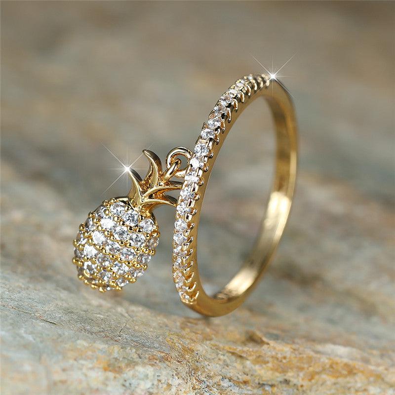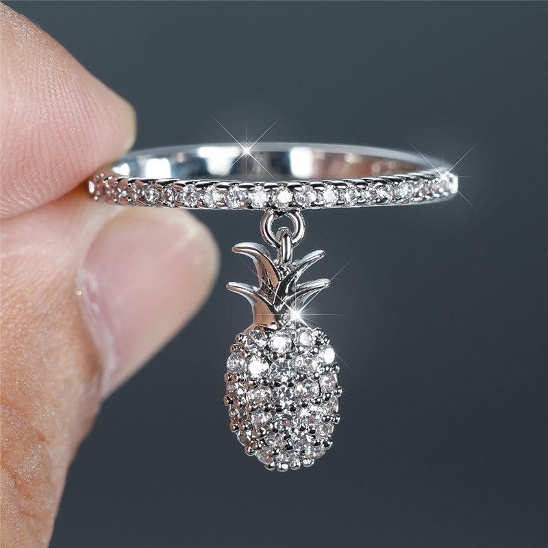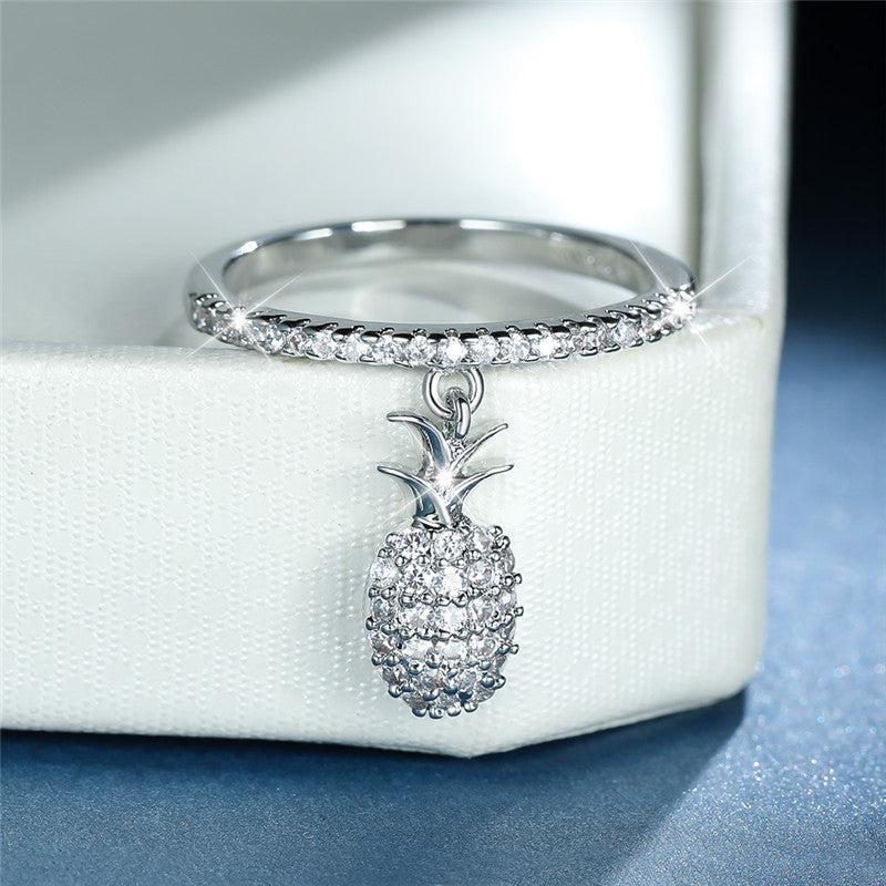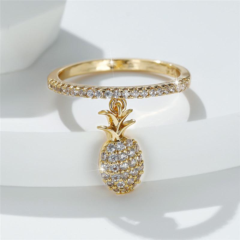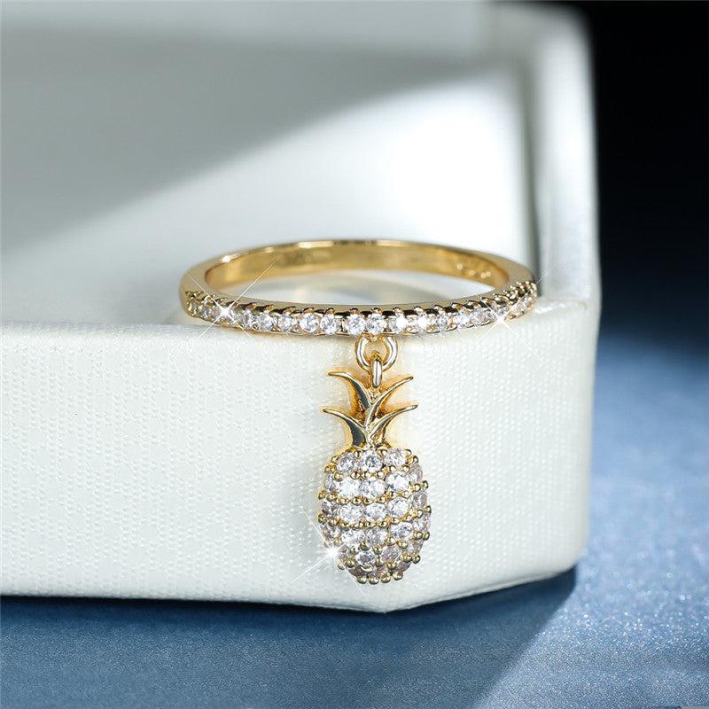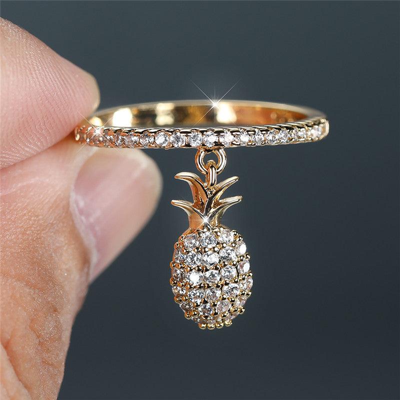 Elegant pineapple ring featuring a fruit pendant with stone inlays in silvery and golden hues.