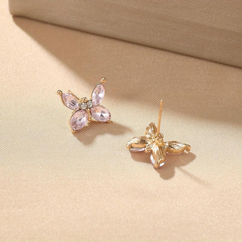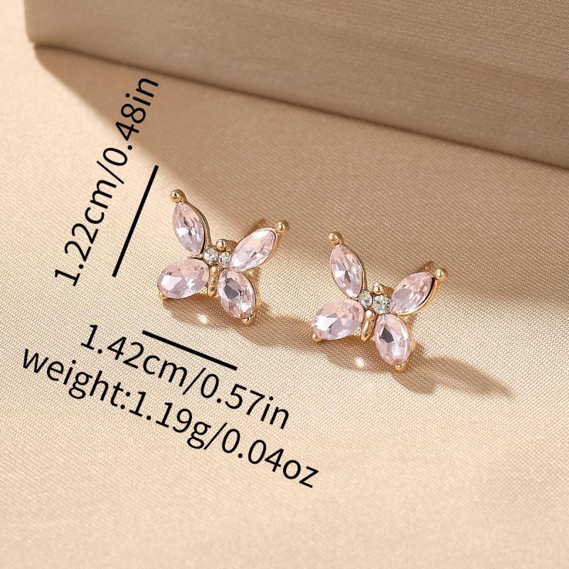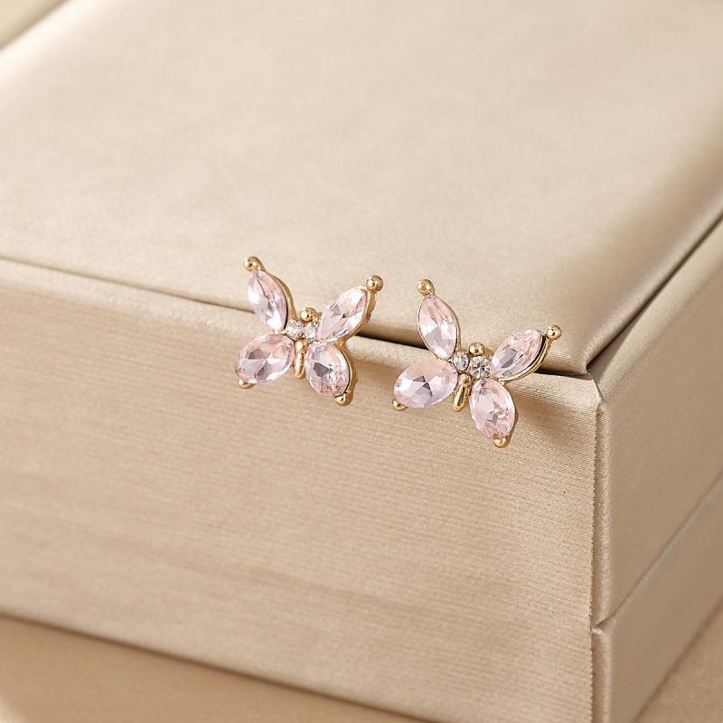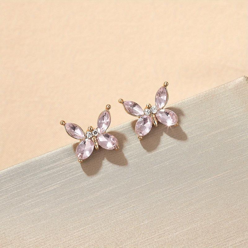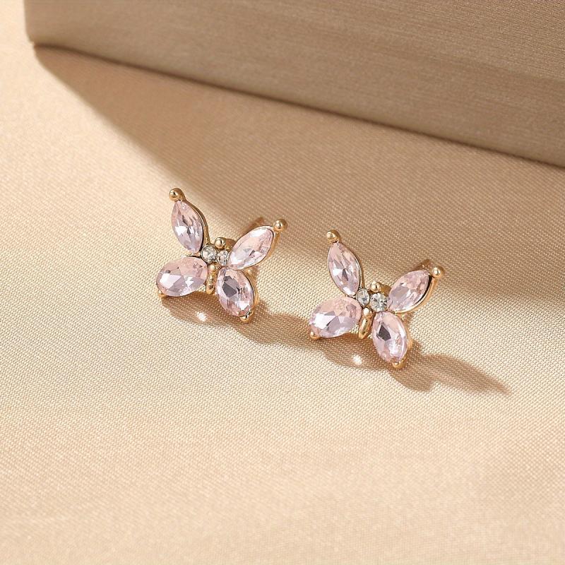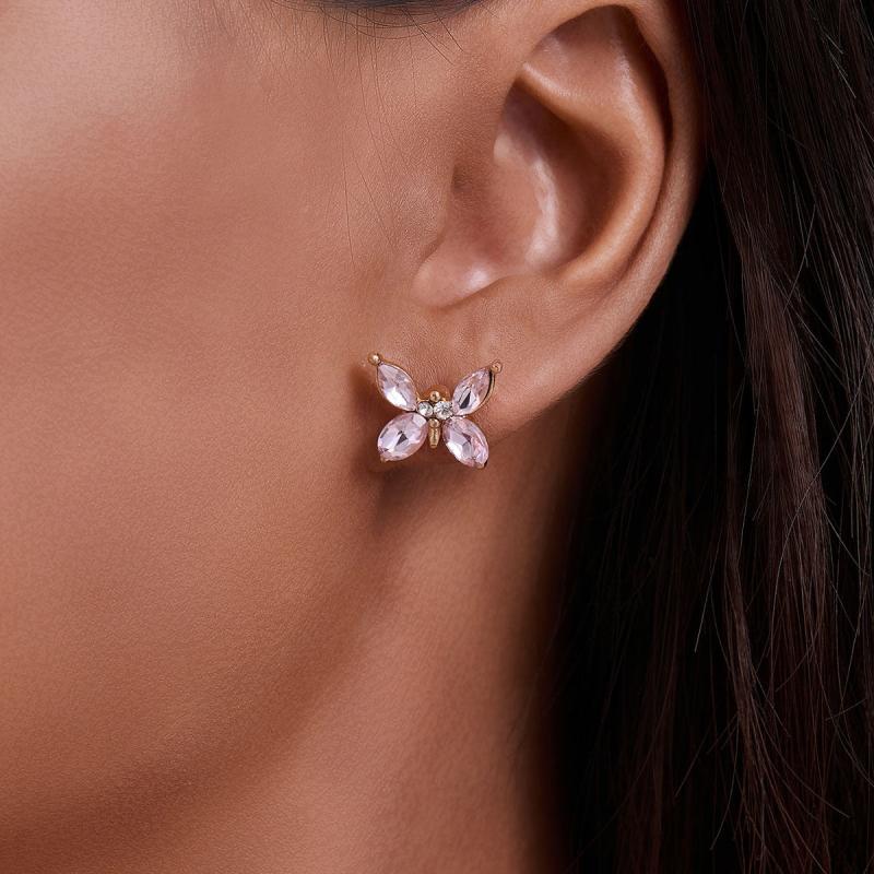 Adorn your ears with these charming pink butterfly ear studs featuring sparkling gemstones. Pair them with the golden tone jewelry for a stunning look.