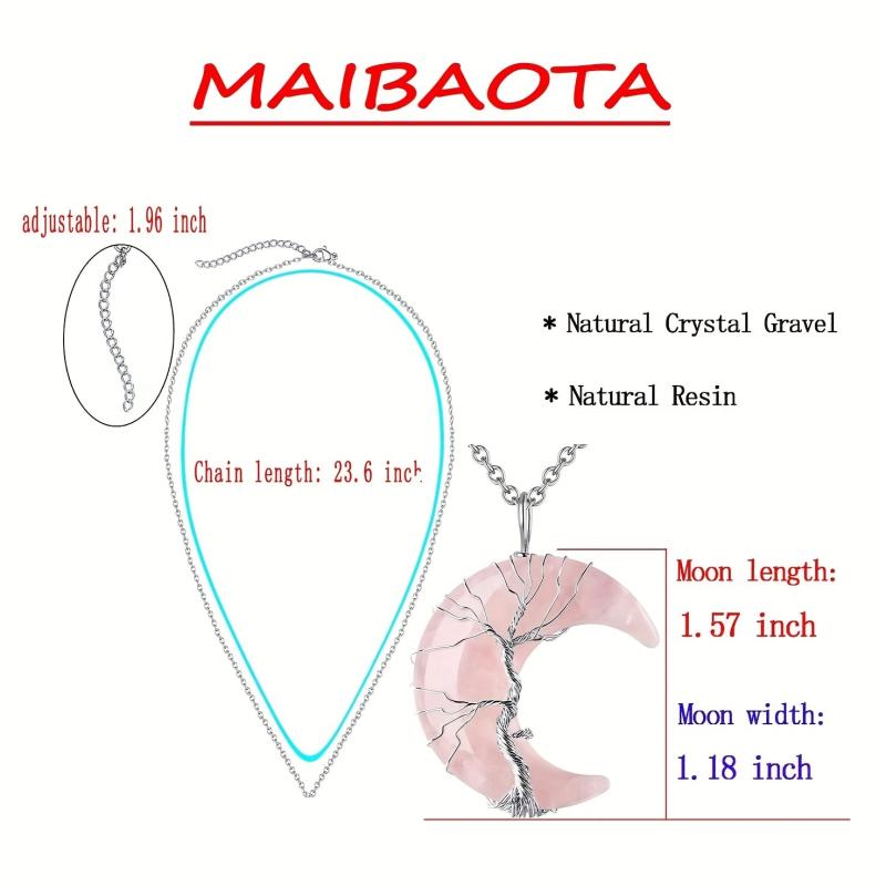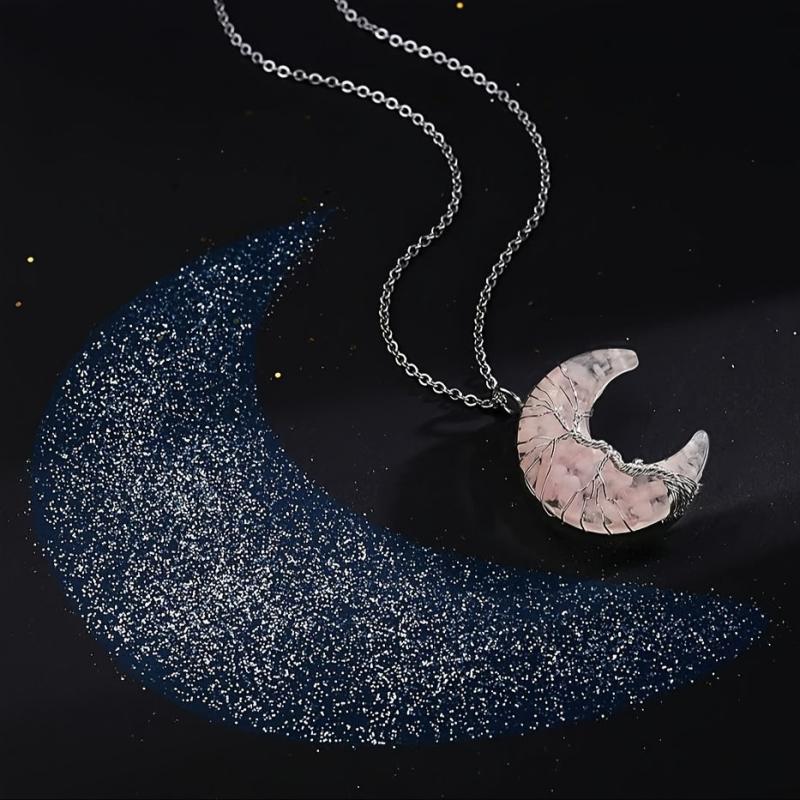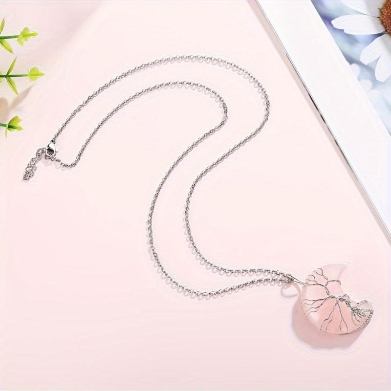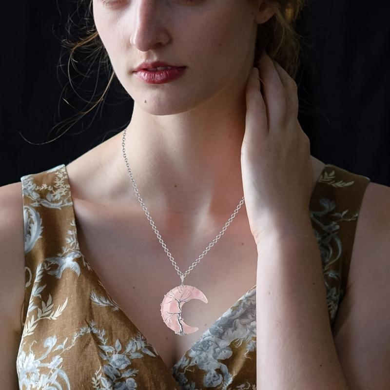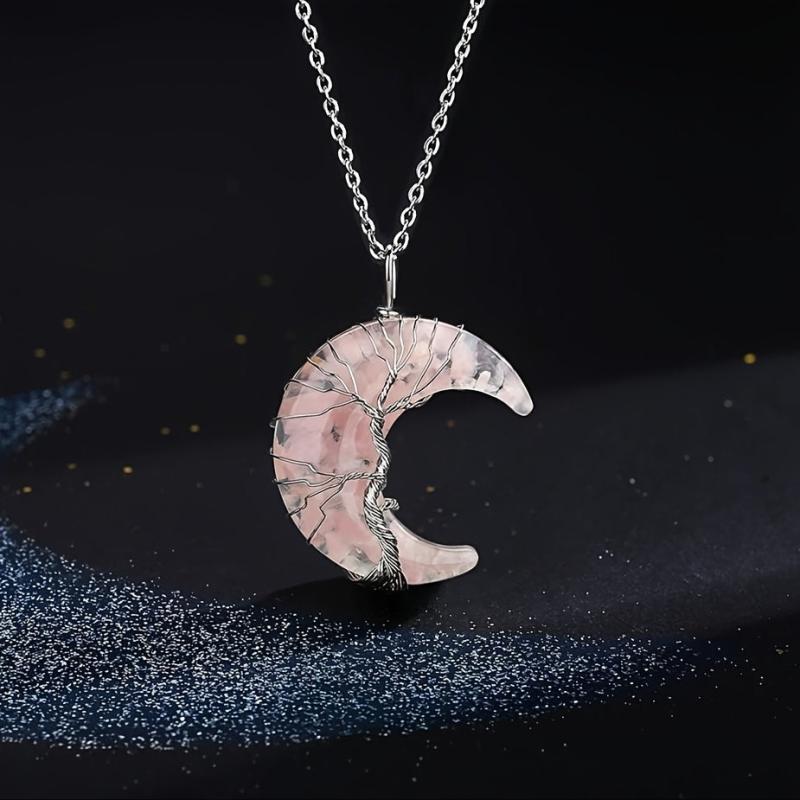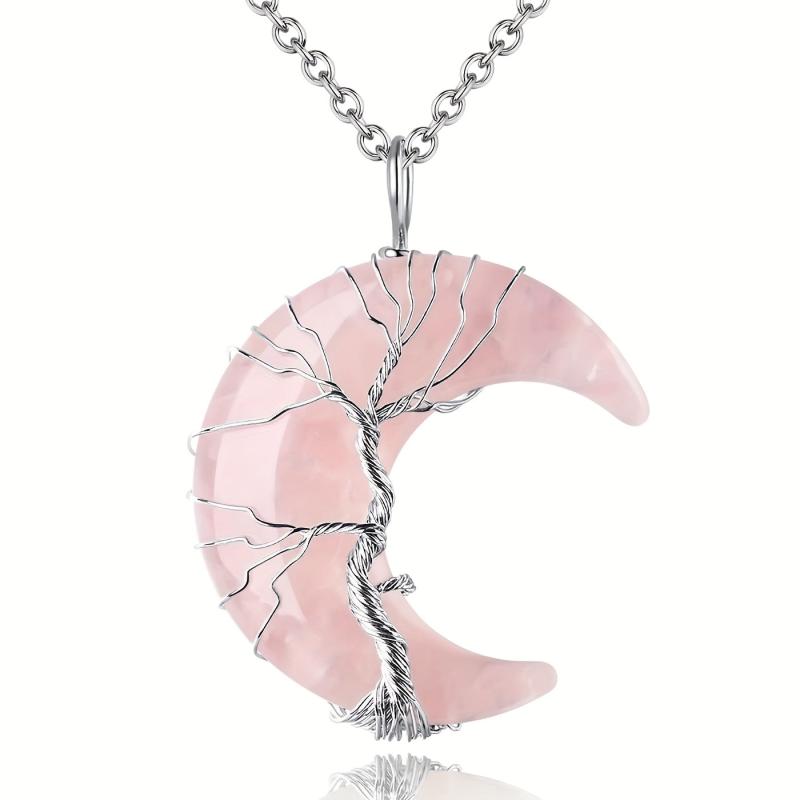 This beautiful necklace features a pink quartz moon pendant with a tree of life crescent moon charm. The natural stone adds a touch of elegance to any outfit.