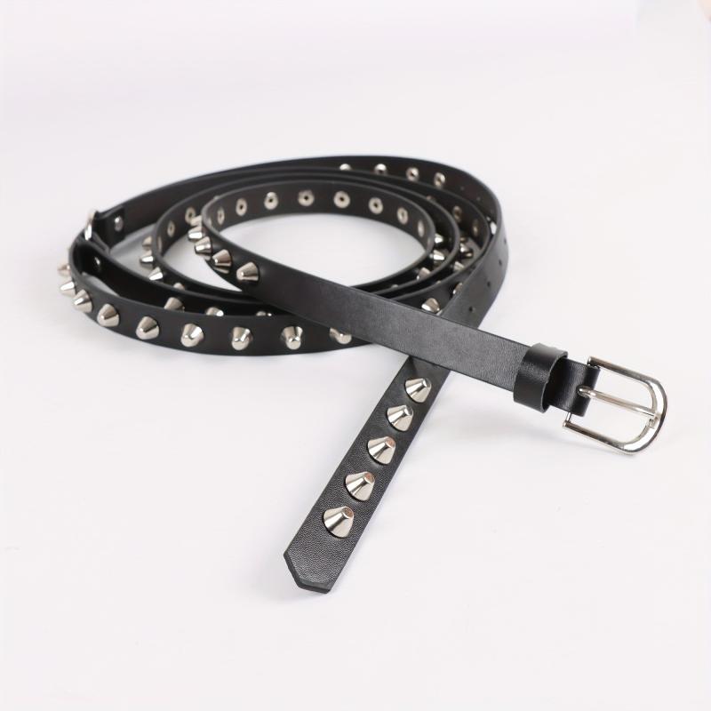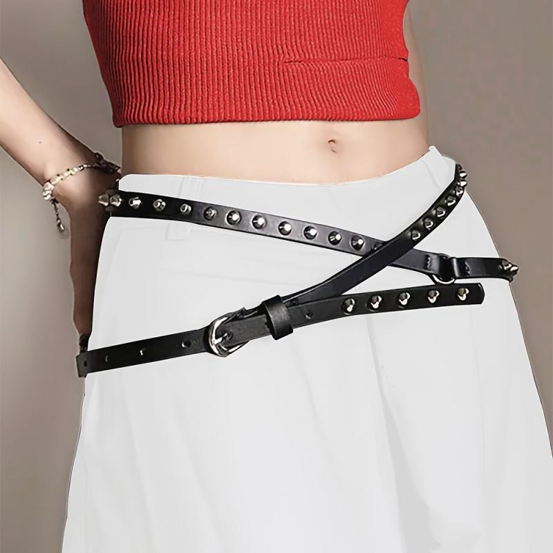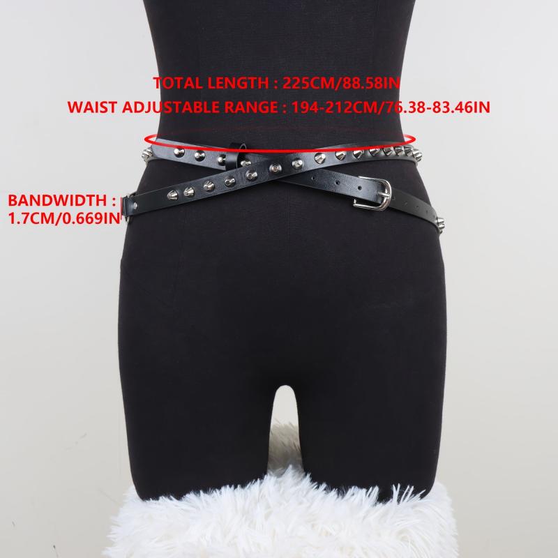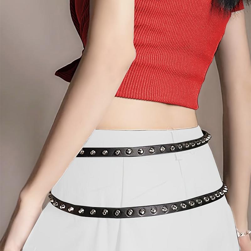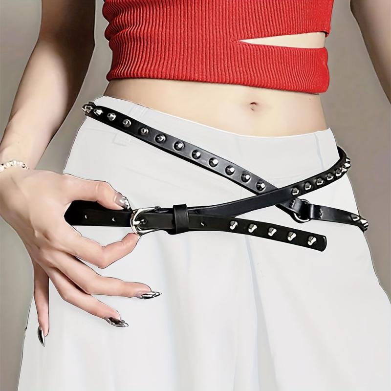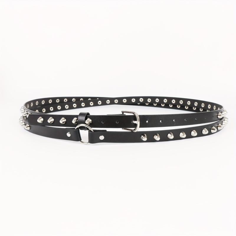 Get the edgy punk cowboy style with this versatile double loop belt featuring bucket nails. Perfect for casual or dressy outfits.