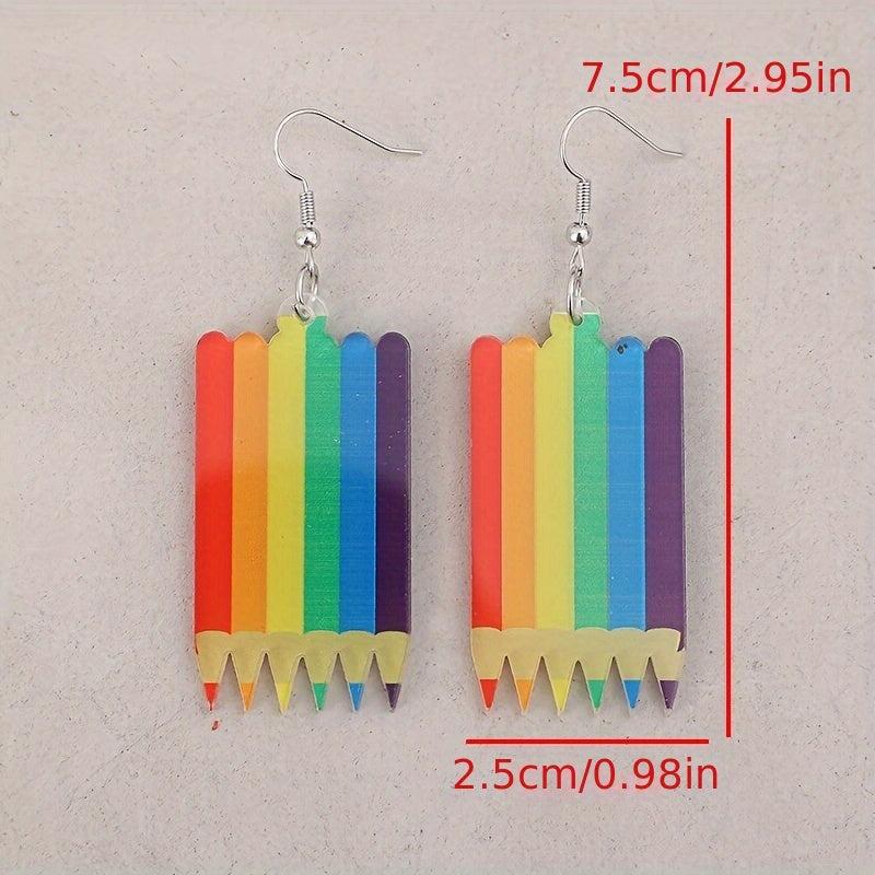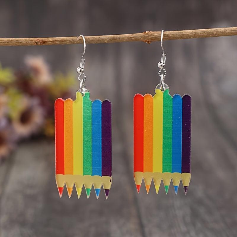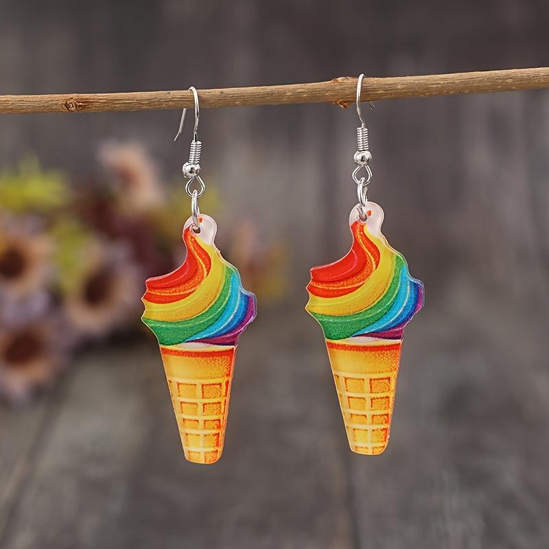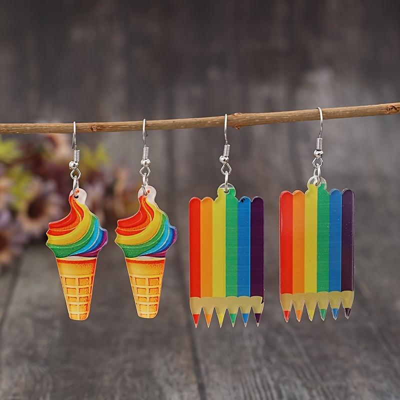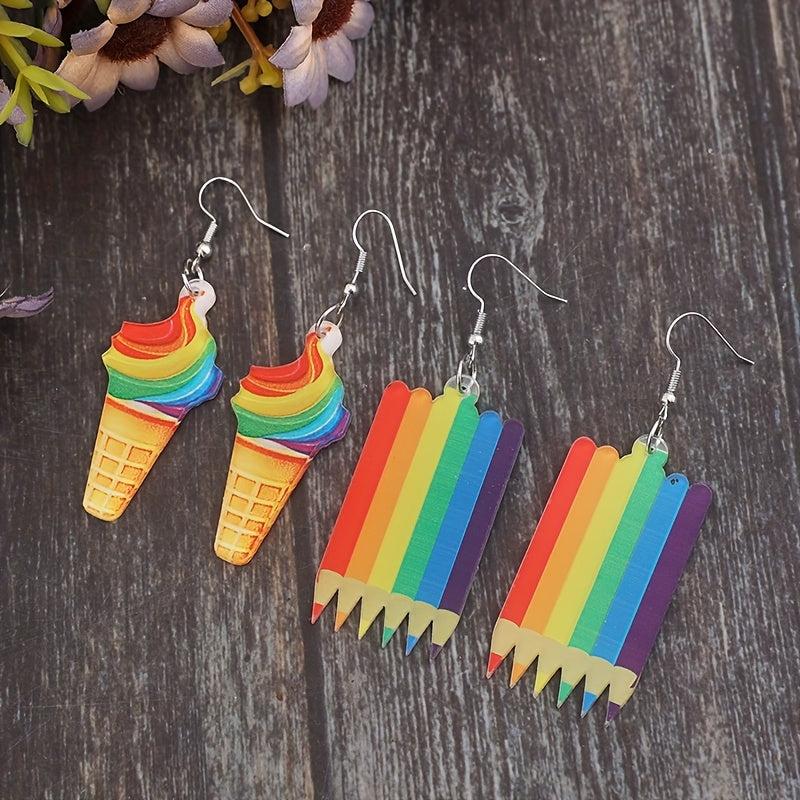 Celebrate Pride Month with these lightweight bohemian style earrings featuring ice cream and pencil designs. Made of colorful acrylic, these earrings are perfect for adding a pop of color to your outfit.
