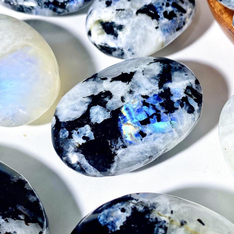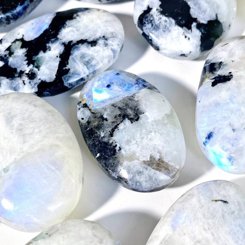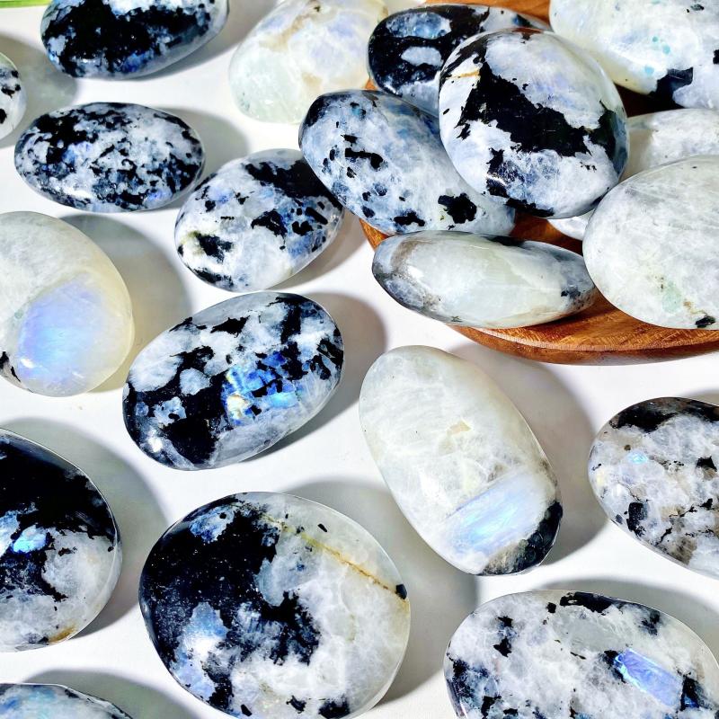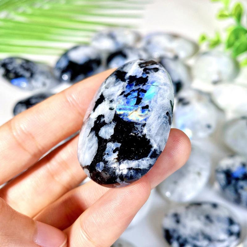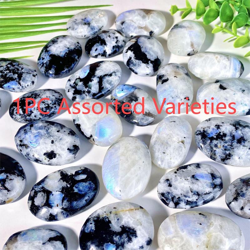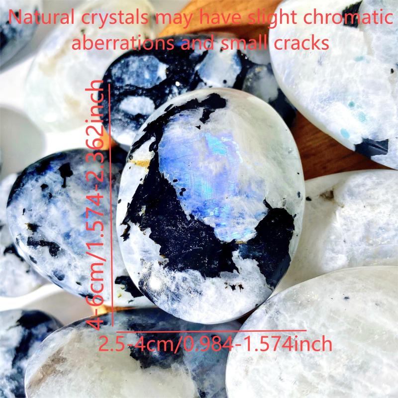 Enhance your creativity with this natural rainbow moonstone palm stone. Featuring an iridescent glitter effect, it is perfect for DIY mosaic art, jewelry making, fish tank decoration, and desktop decor. Each piece is unique with an irregular shape.