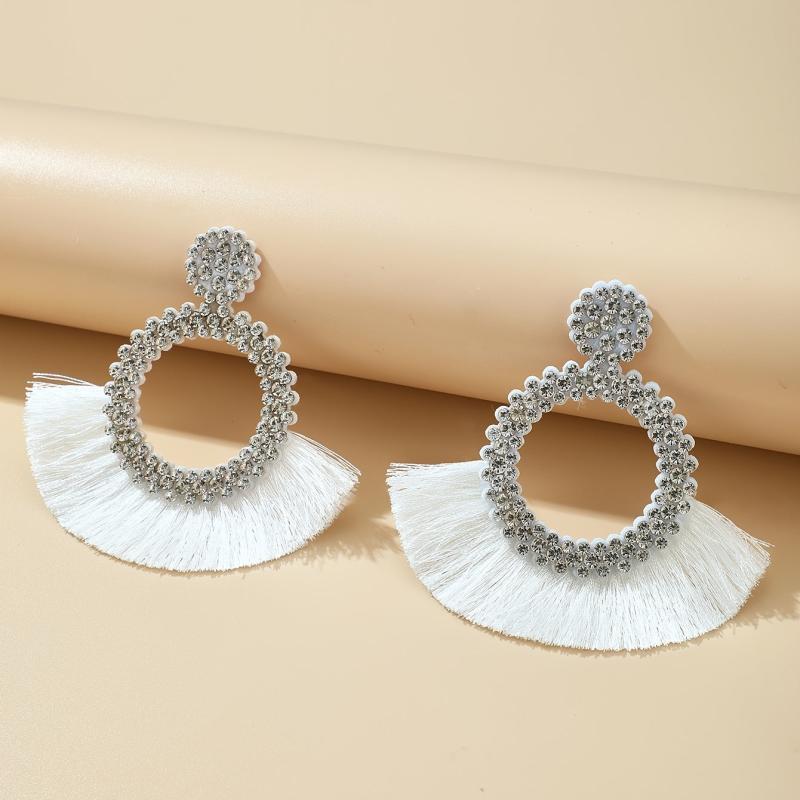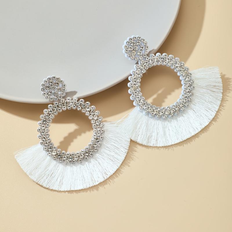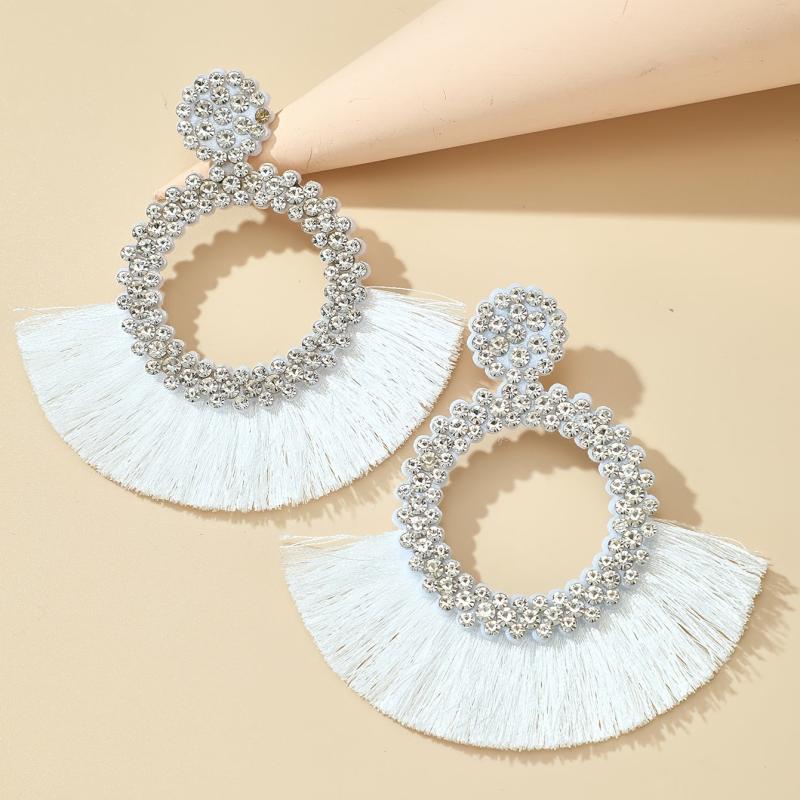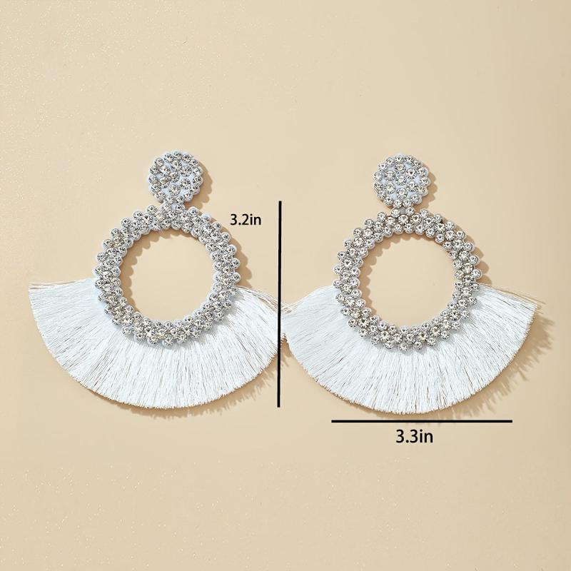 Make a statement with these stunning tassel drop earrings featuring full rhinestone accents. Perfect for summer accessorizing.
