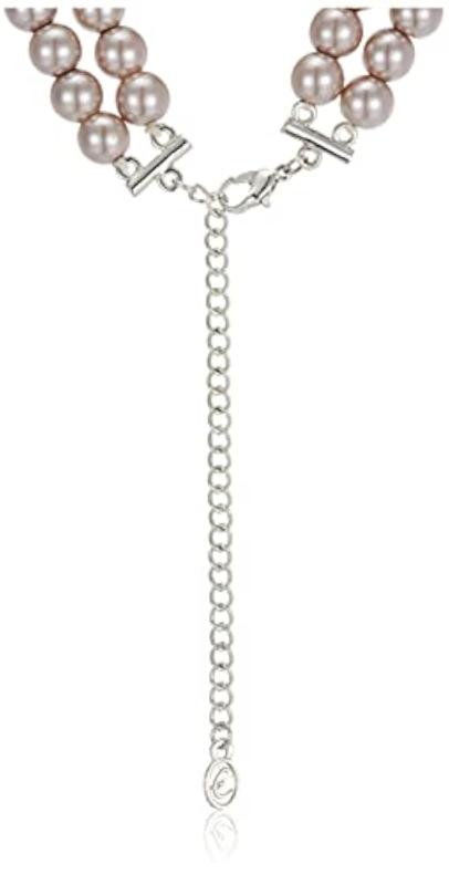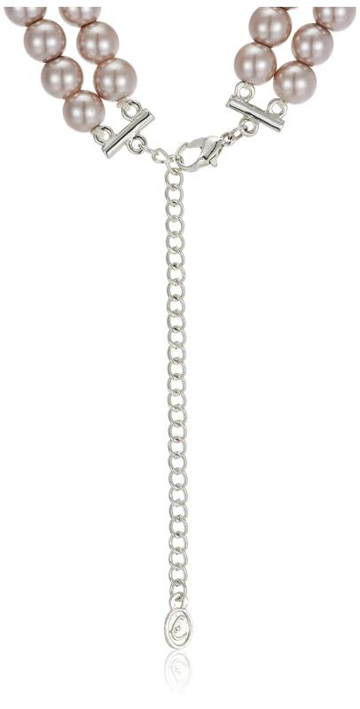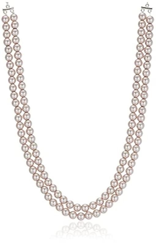 Elegant pearl necklace with double line design and lobster clasp, plated in rhodium for a luxurious finish.