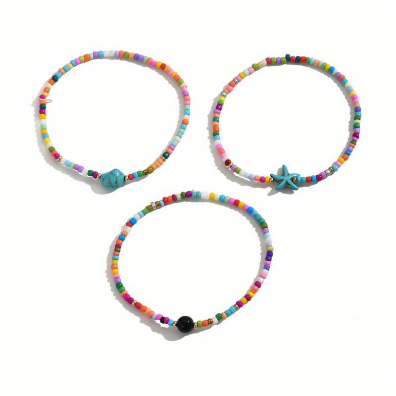 Elevate your beachwear with this set of 3 ankle bracelets featuring layered glass bead strands with starfish charms. Perfect for adding a touch of summer vacation style to your daily outfits.