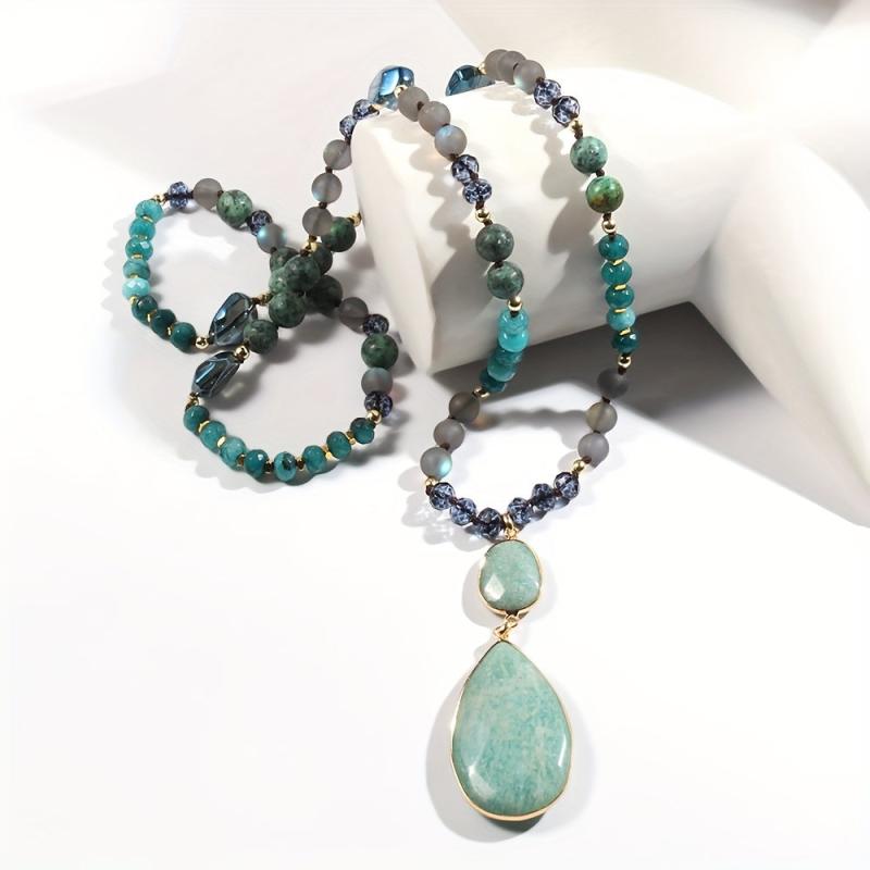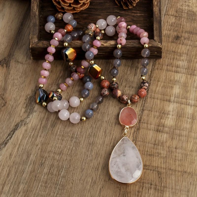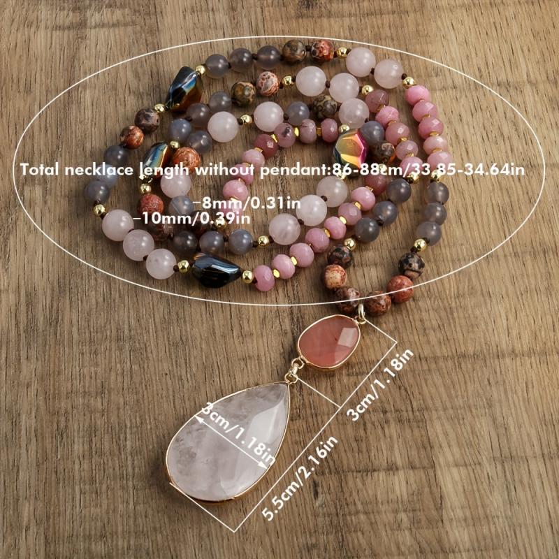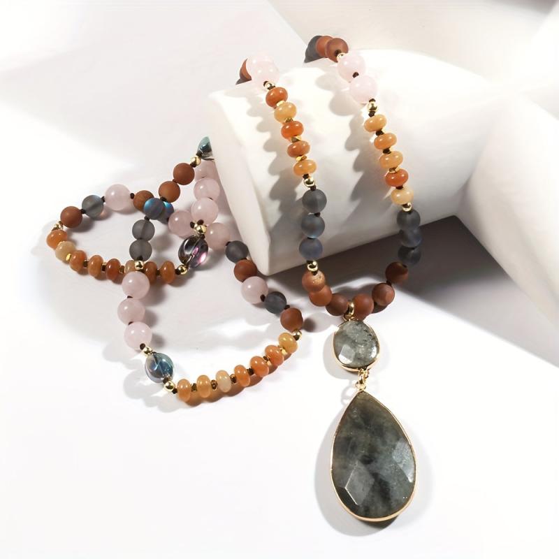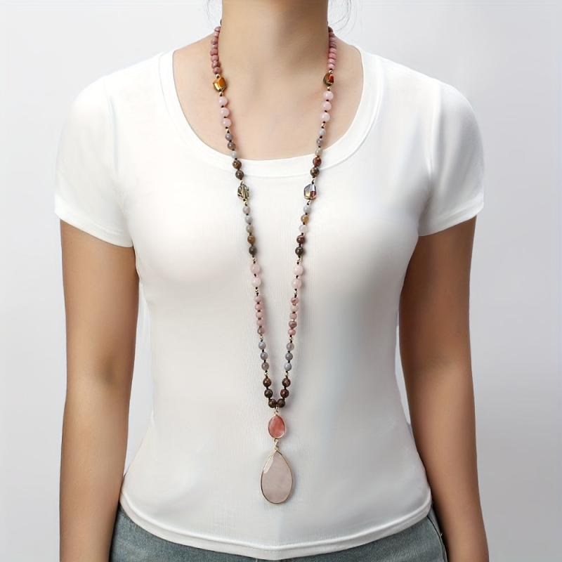 Elevate your style with this necklace featuring a mix of natural stone and glass beads. The pendant adds a touch of elegance to any outfit.