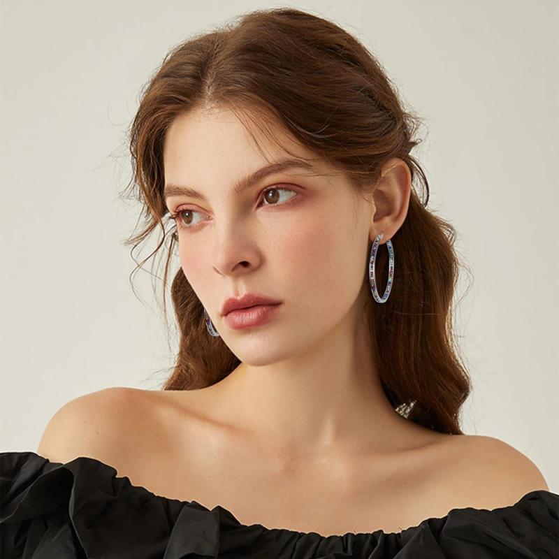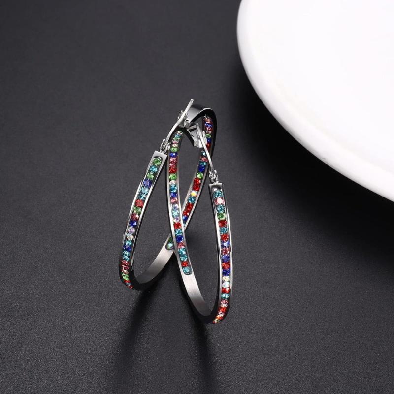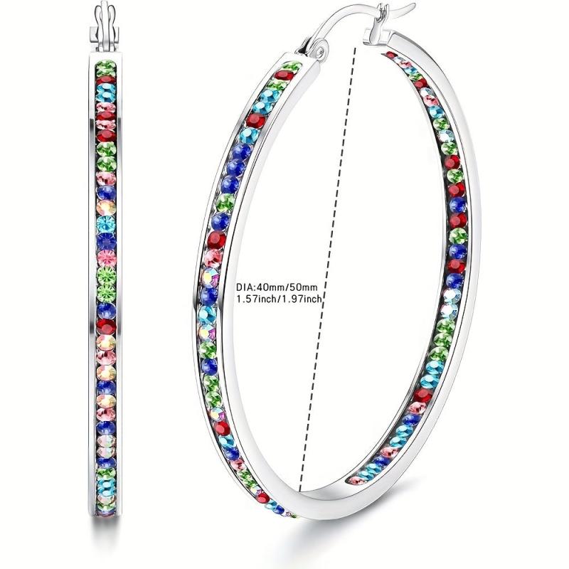 Elegant stainless steel hoop earrings set with colorful rhinestones. Perfect accessory for Christmas.