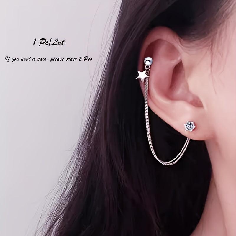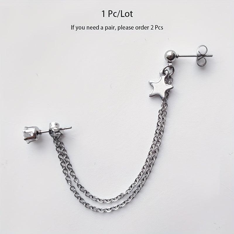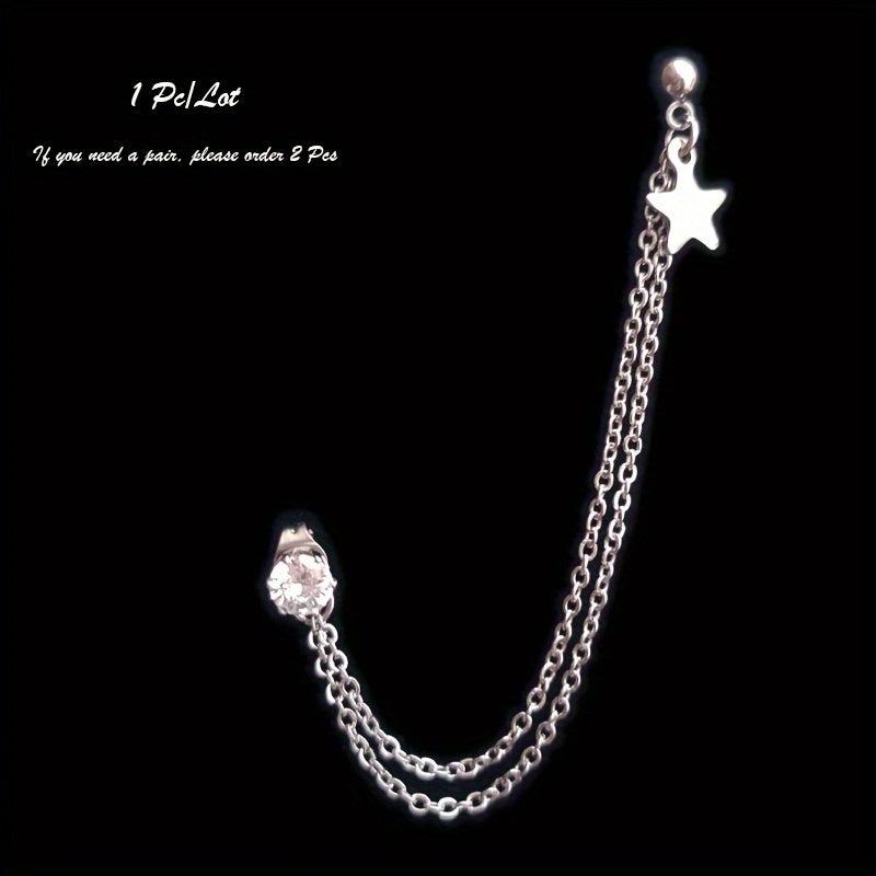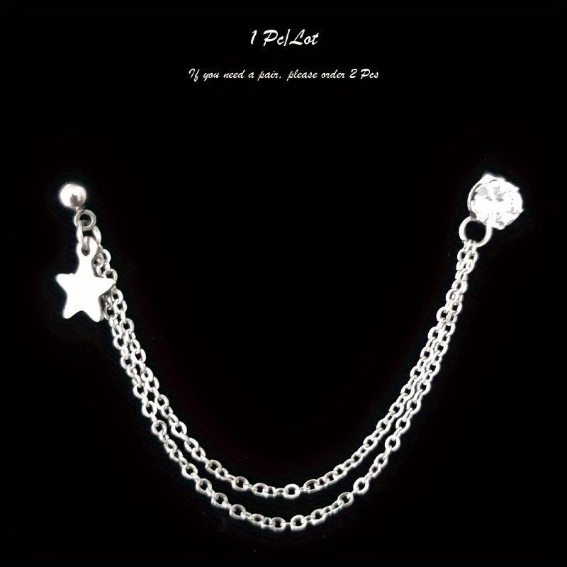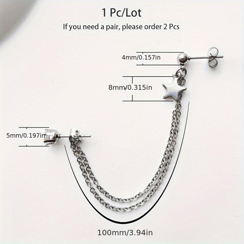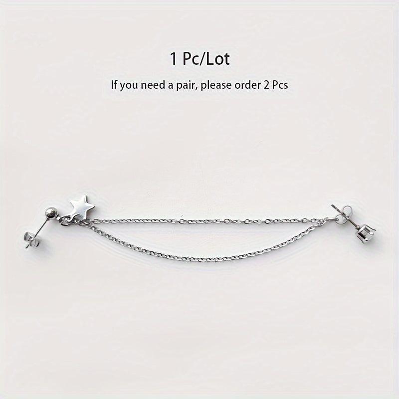 These stylish earrings feature a full ear design with a silvery star pendant and conjoined chain. Made from high-quality stainless steel with synthetic zirconia accents.