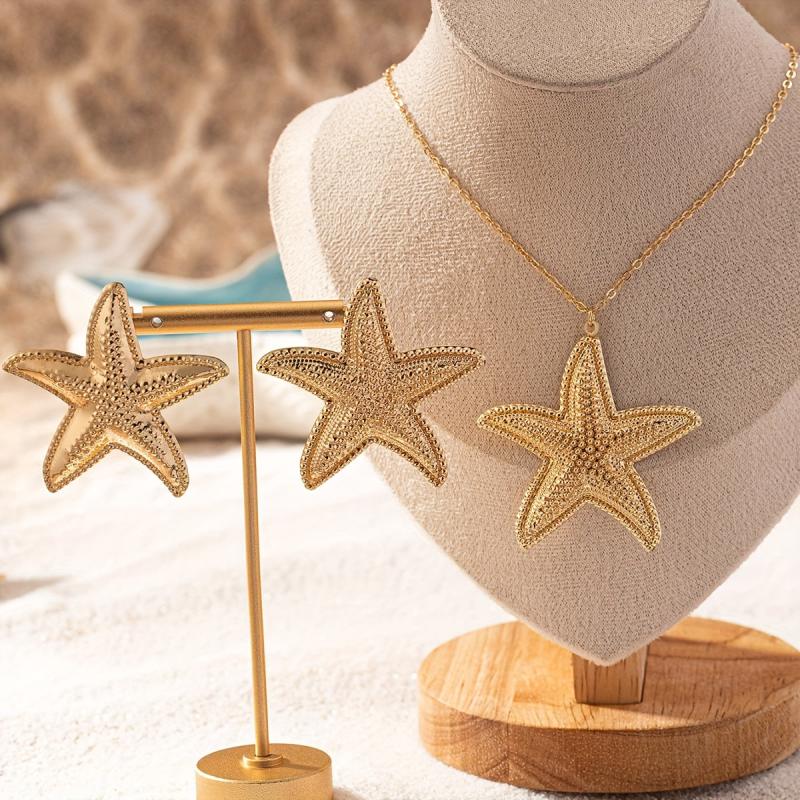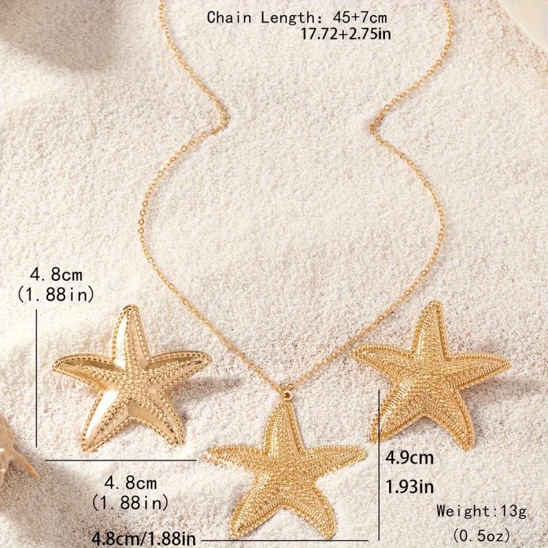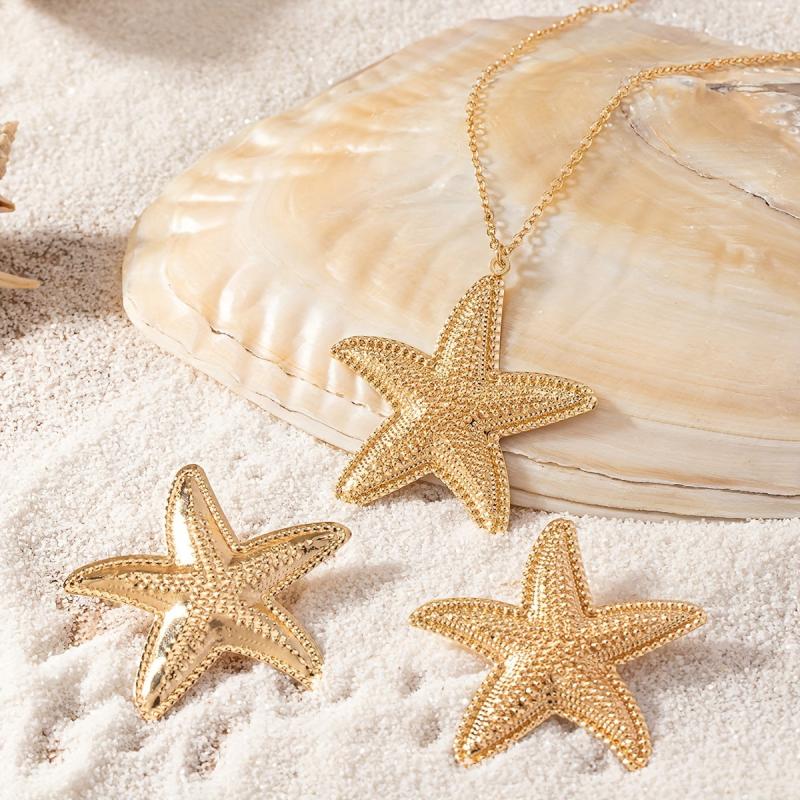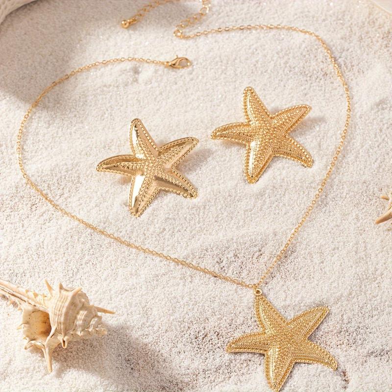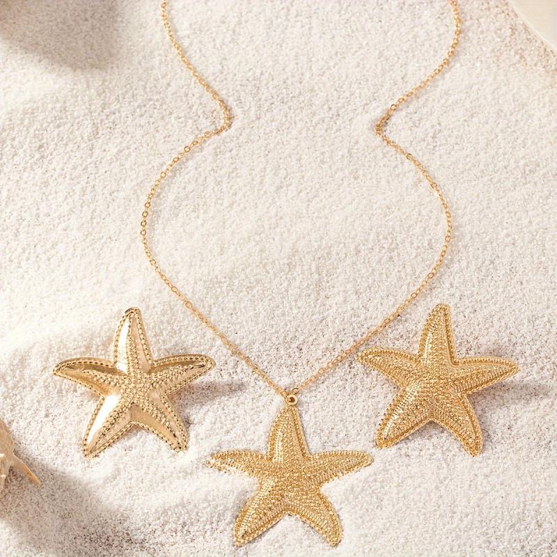 Enhance your everyday and holiday outfits with this fashionable starfish jewelry set. The golden necklace and earrings are perfect for adding a touch of beachy elegance to any look.