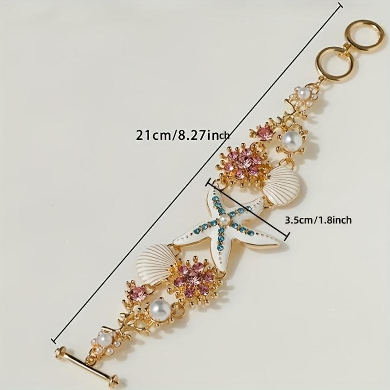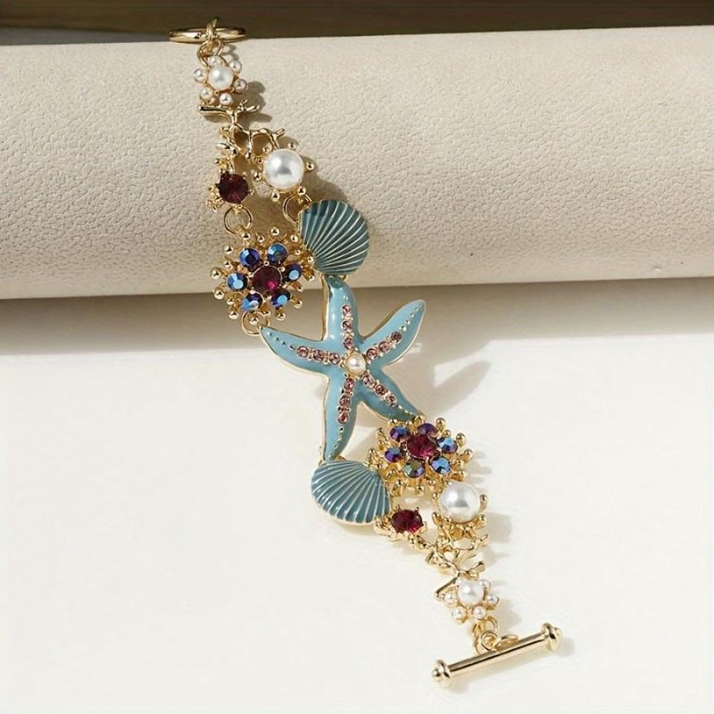Elevate your beach style with this stunning starfish pendant bracelet featuring intricate shell details and sea coral beads. Perfect for daily wear or an ocean vacation.