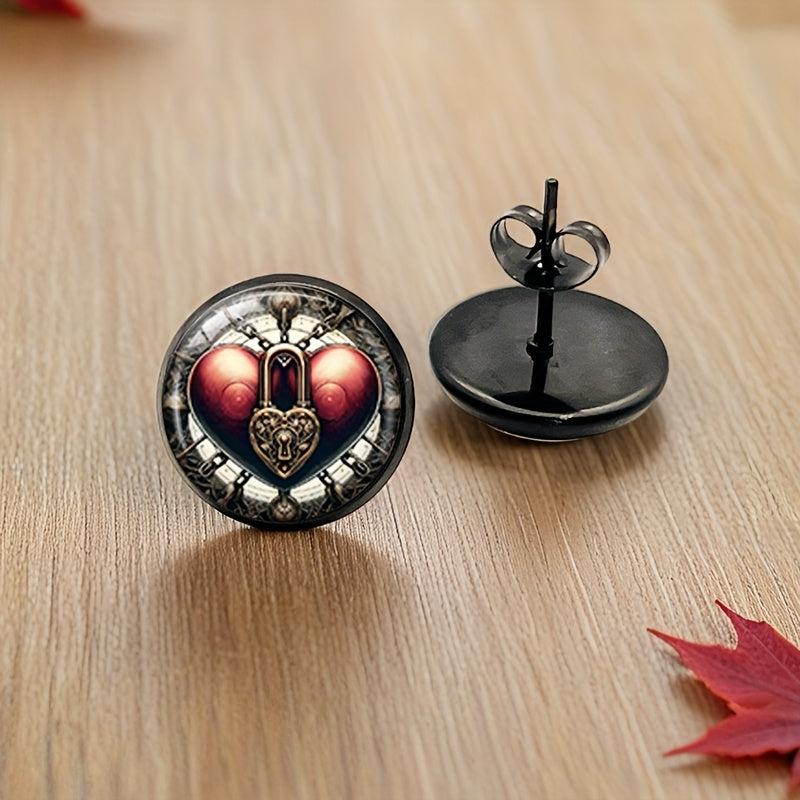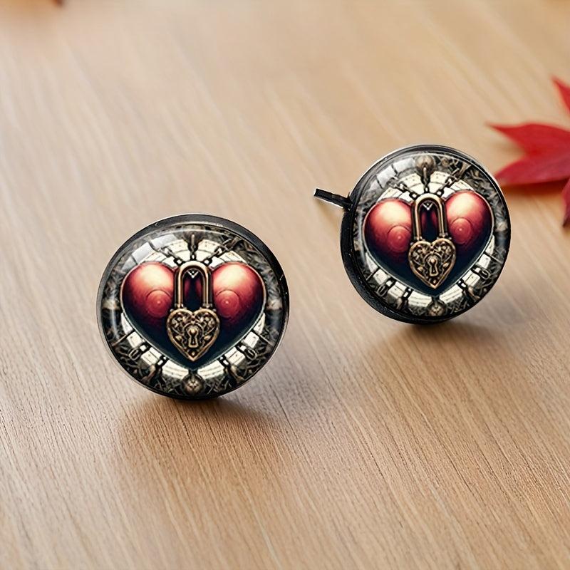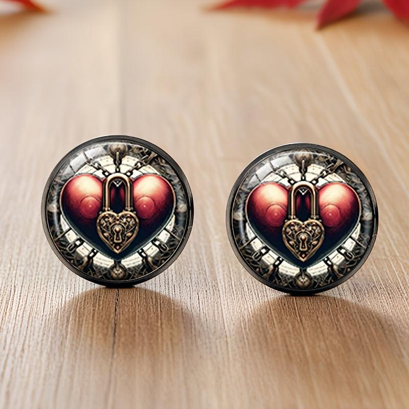 Vintage-inspired earrings featuring a pair of heart lock dangle studs with a golden chain, perfect for everyday wear. Made with an iron base and glass accents.