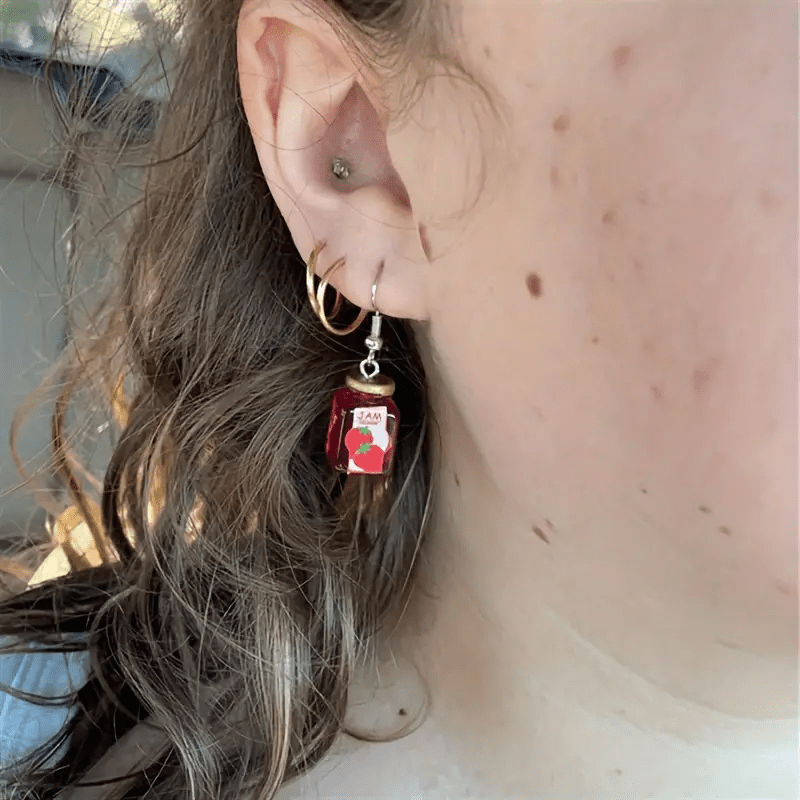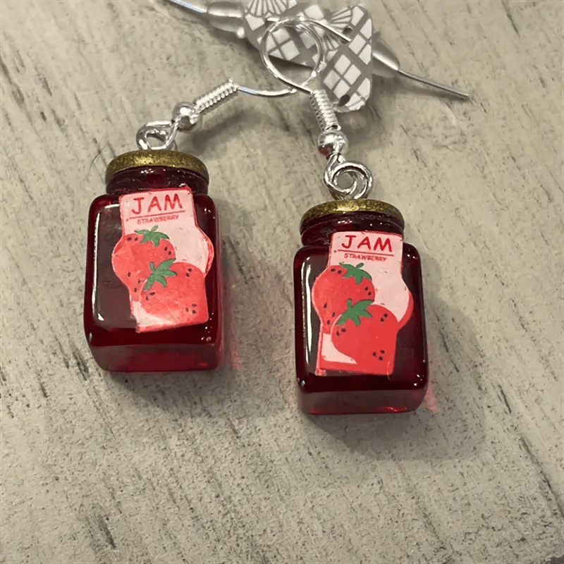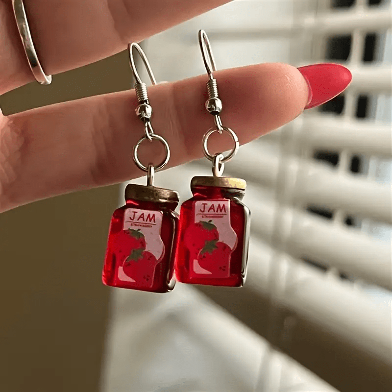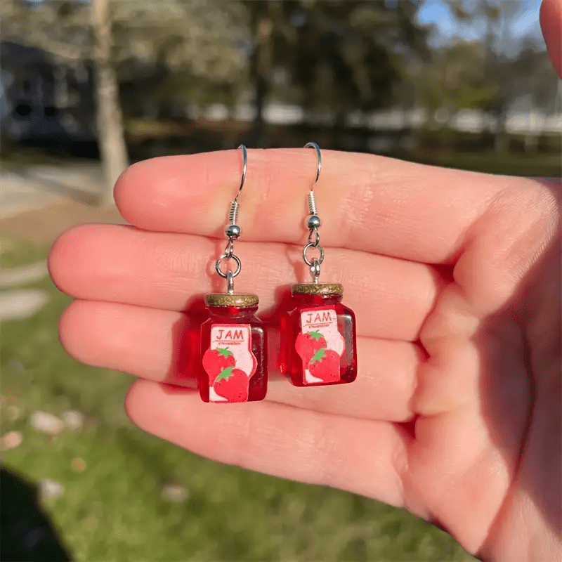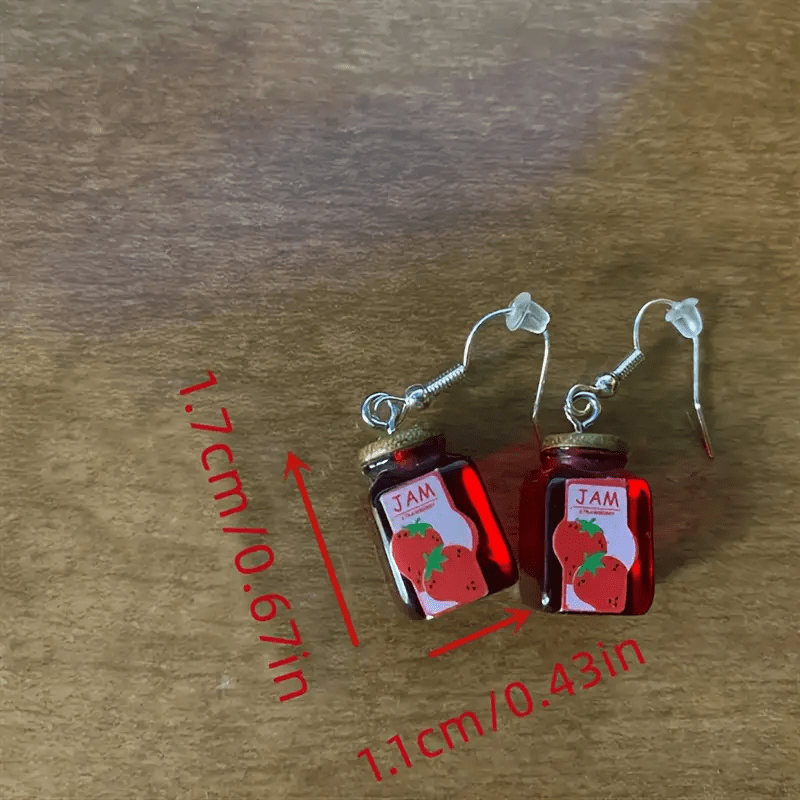 Chic and stylish strawberry jam jar earrings made of resin, perfect for daily wear and vacation. No feather copper ear wire for comfortable fit.