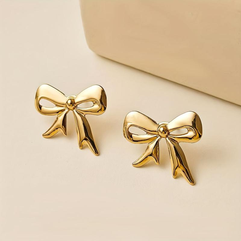 These classic bow stud earrings are minimalistic yet stylish, perfect for casual outfits. Made from iron material with a golden tone finish.