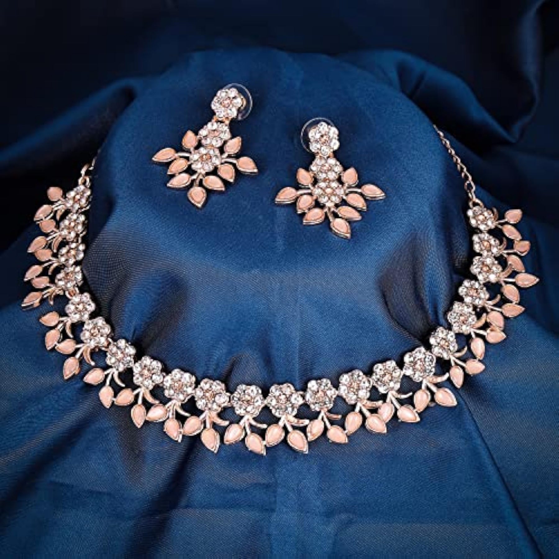 Elegant floral design jewellery set with kundan studding, plated in luxurious rose gold finish.