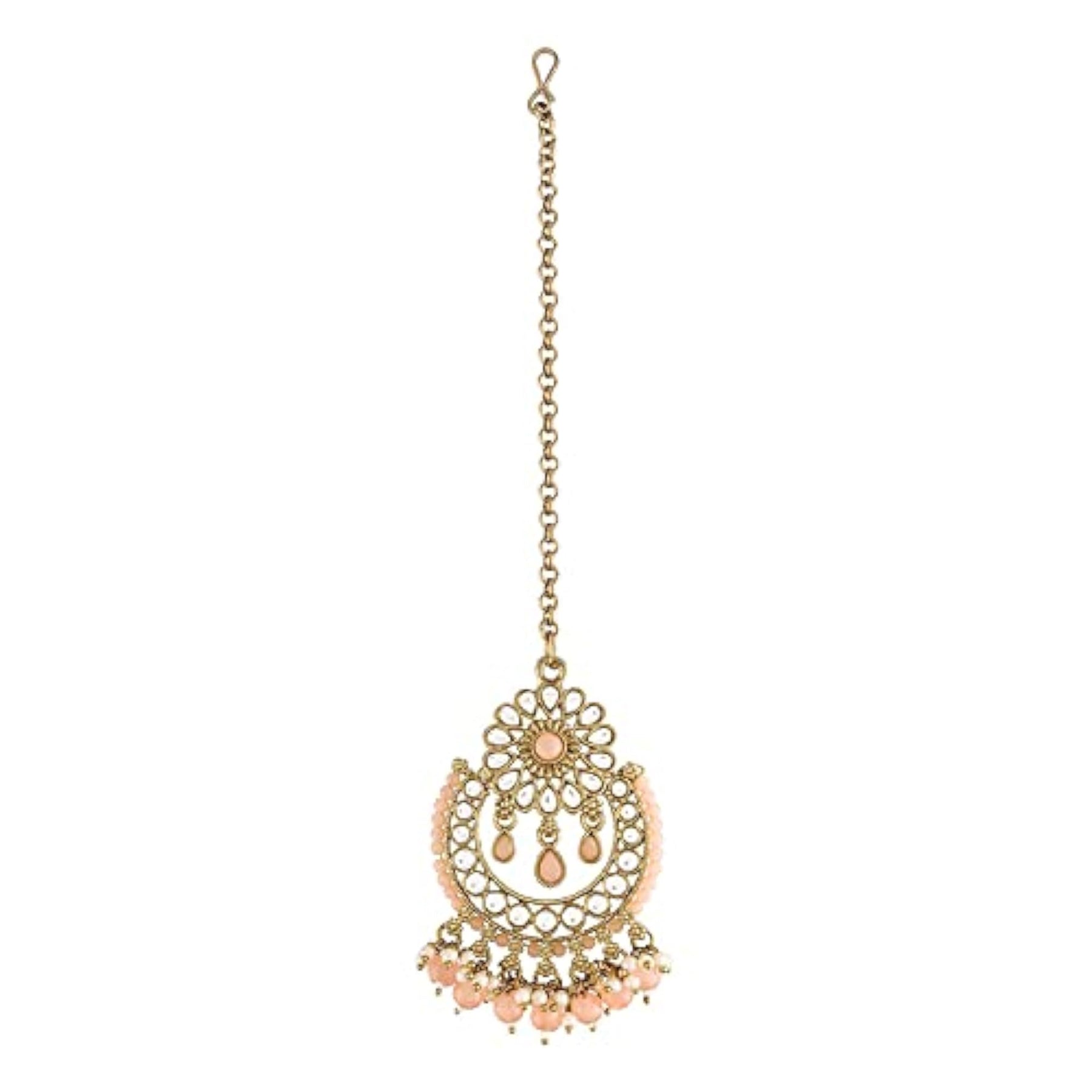 Elegant 18K plated maang tikka with traditional Kundan and pearl detailing. Perfect for special occasions and weddings.