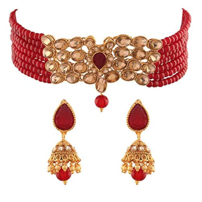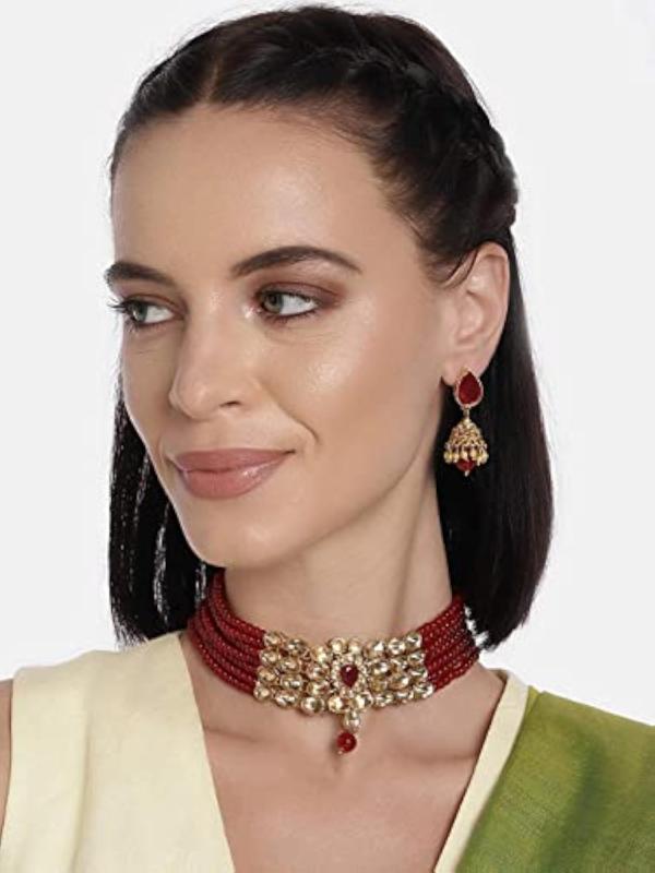 Elegant choker necklace set featuring kundan and beads. Perfect for special occasions.