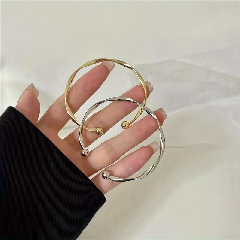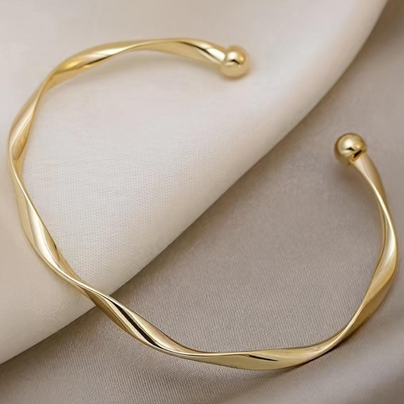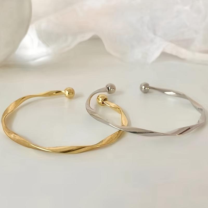 A sleek and modern women's bangle featuring a minimalist twisted design. This adjustable bangle is perfect for everyday wear and can easily complement any outfit.