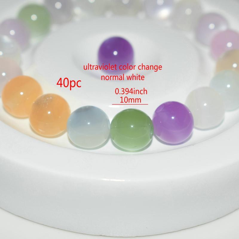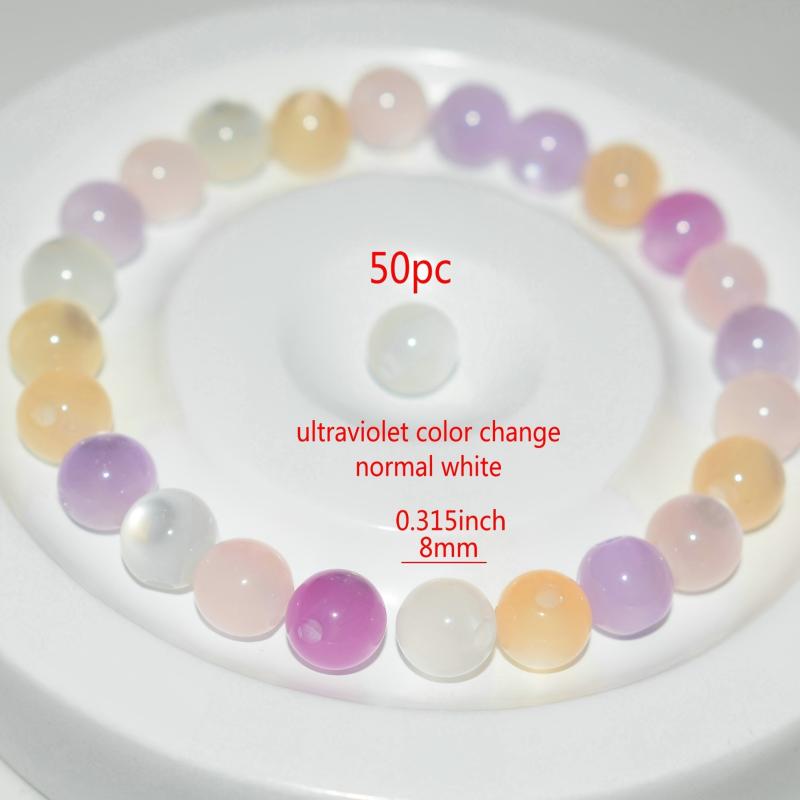 This set includes 50 pieces of 8mm beads, 40 pieces of 10mm beads, and 30 pieces of 12mm beads that appear normal indoors but change color under UV light. Ideal for creating unique DIY jewelry pieces.