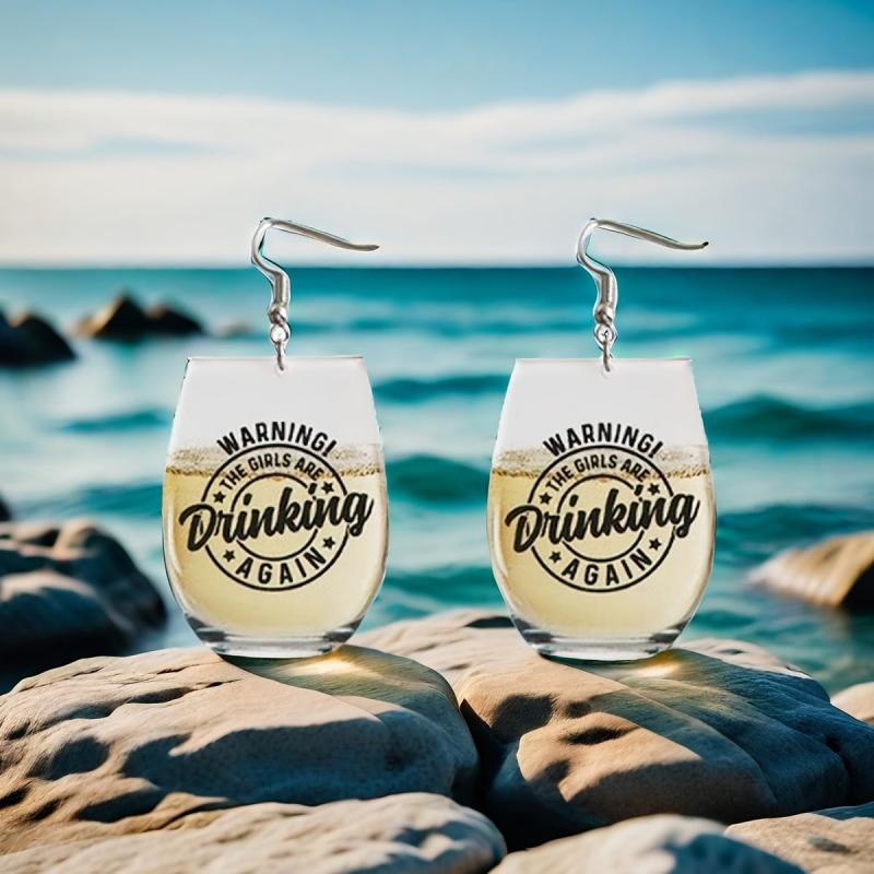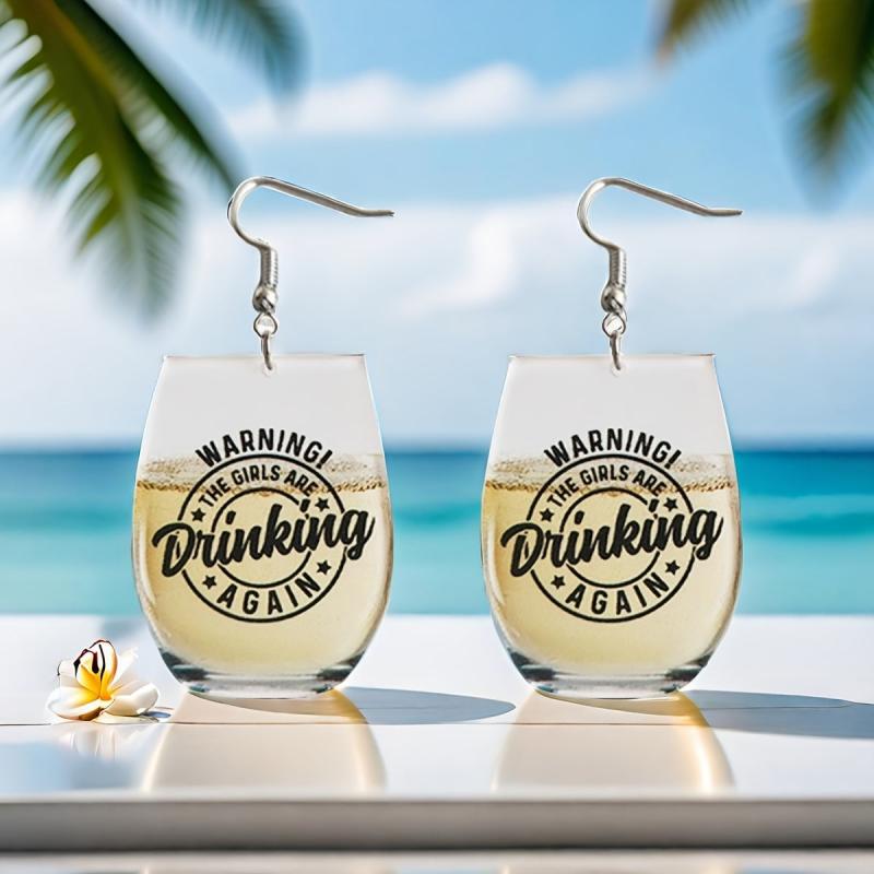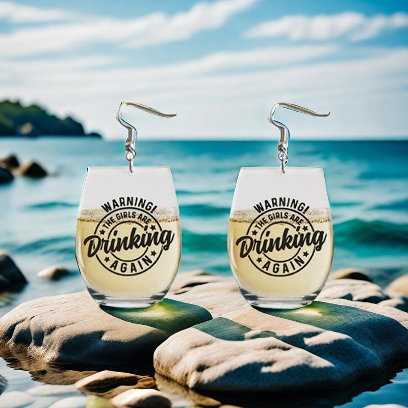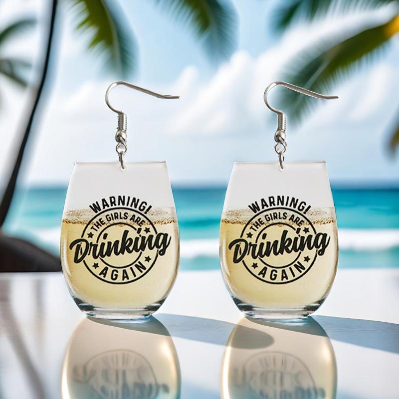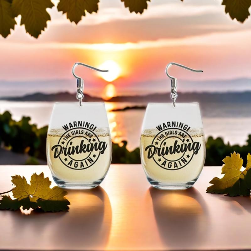 Chic earrings for wine lovers featuring a fun 'The Girls Are Drinking Again' print. Perfect accessory for a girls' night out.