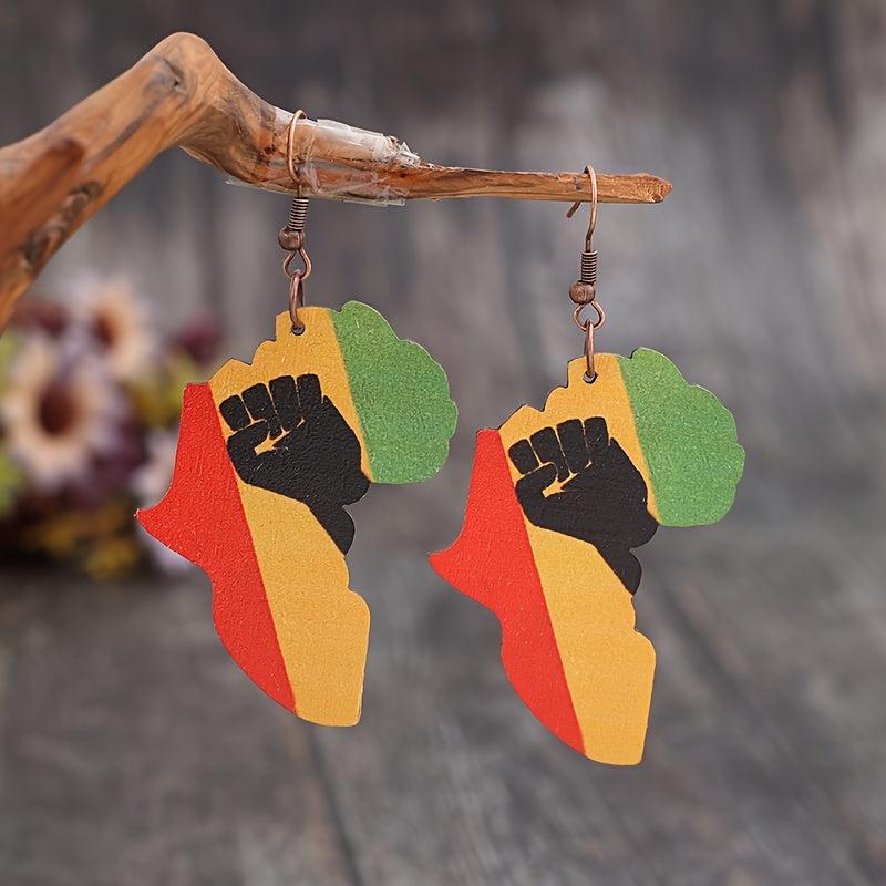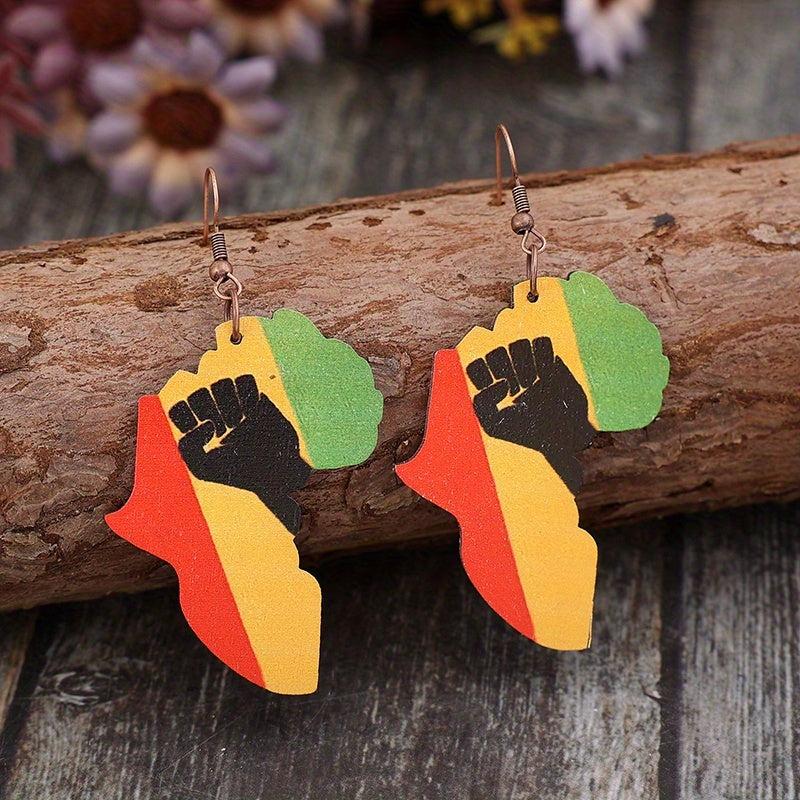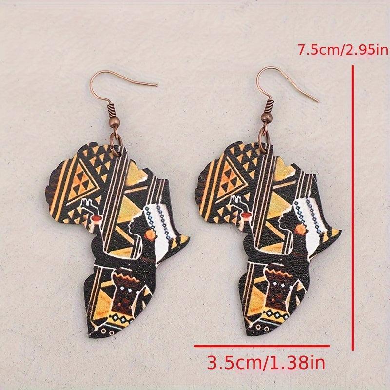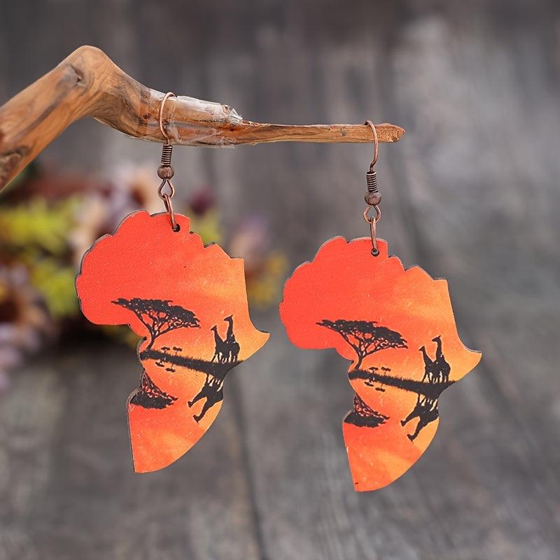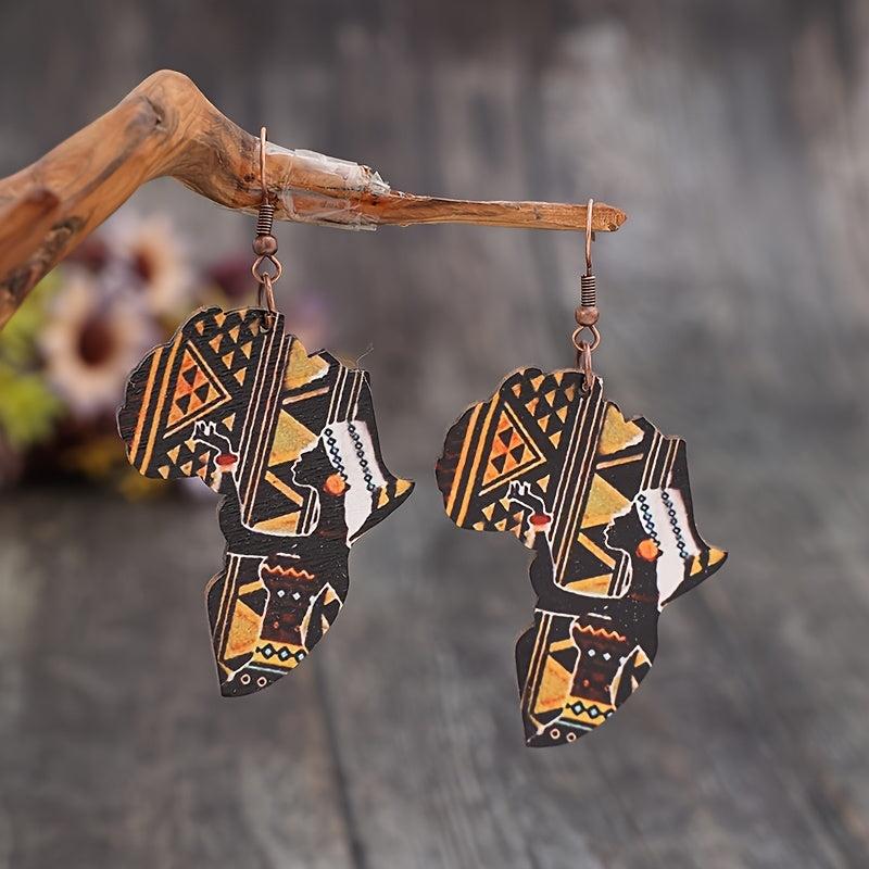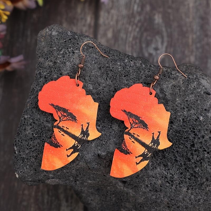 These unique earrings feature a beautiful sunset goddess design inspired by African culture. Handcrafted from wood, they are a colorful and bohemian addition to your jewelry collection.