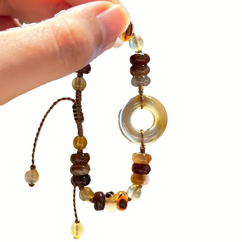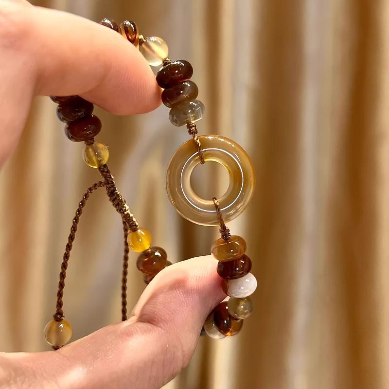 This handcrafted bracelet features amber colored glass and resin beads with a peace symbol charm. Perfect for casual attire.