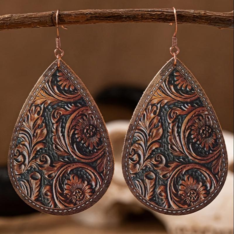 Add a touch of vintage bohemian style to your look with these unique PU leather earrings featuring an ethnic water drop print and ancient pattern design.
