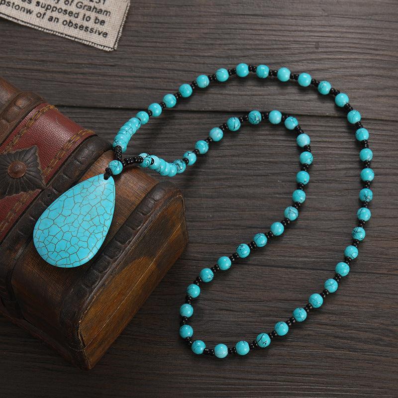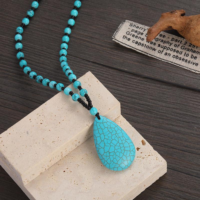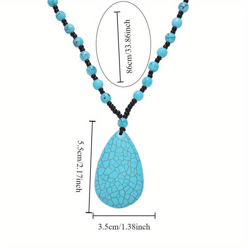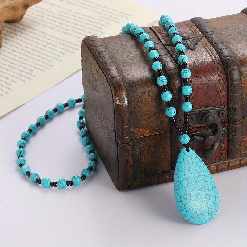 This stylish necklace features a blend of turquoise and beads, with a dangling teardrop pendant. Perfect for daily wear or special occasions, this boho-inspired piece adds a touch of charm to your outfit.
