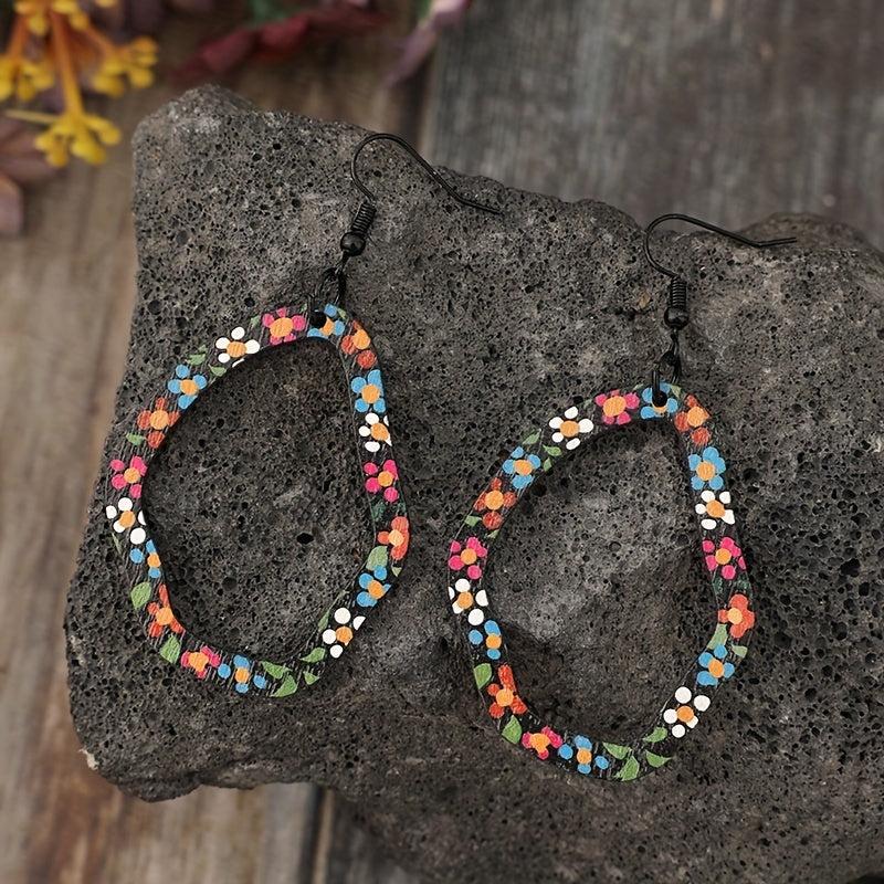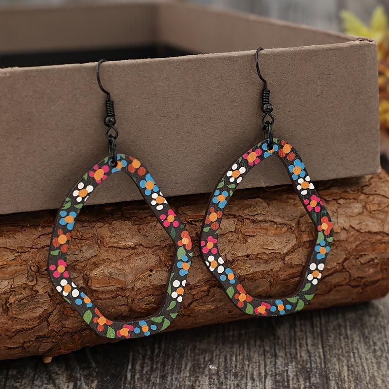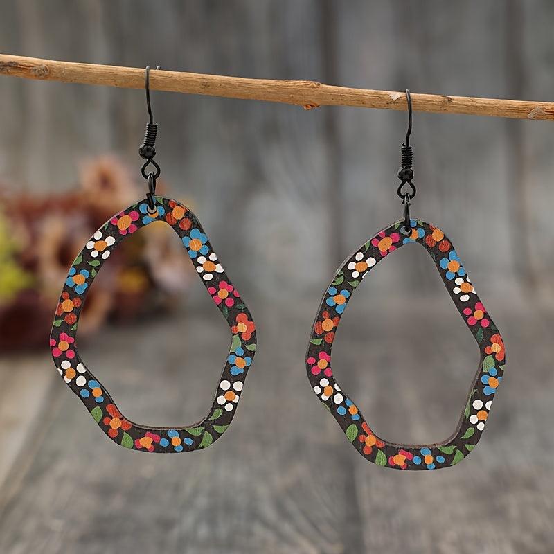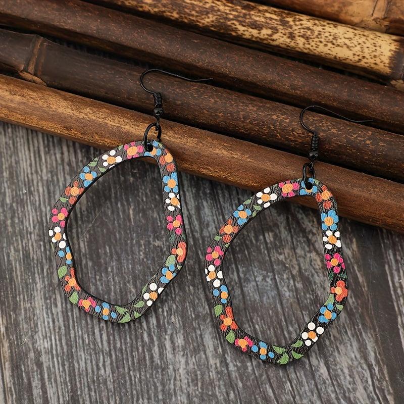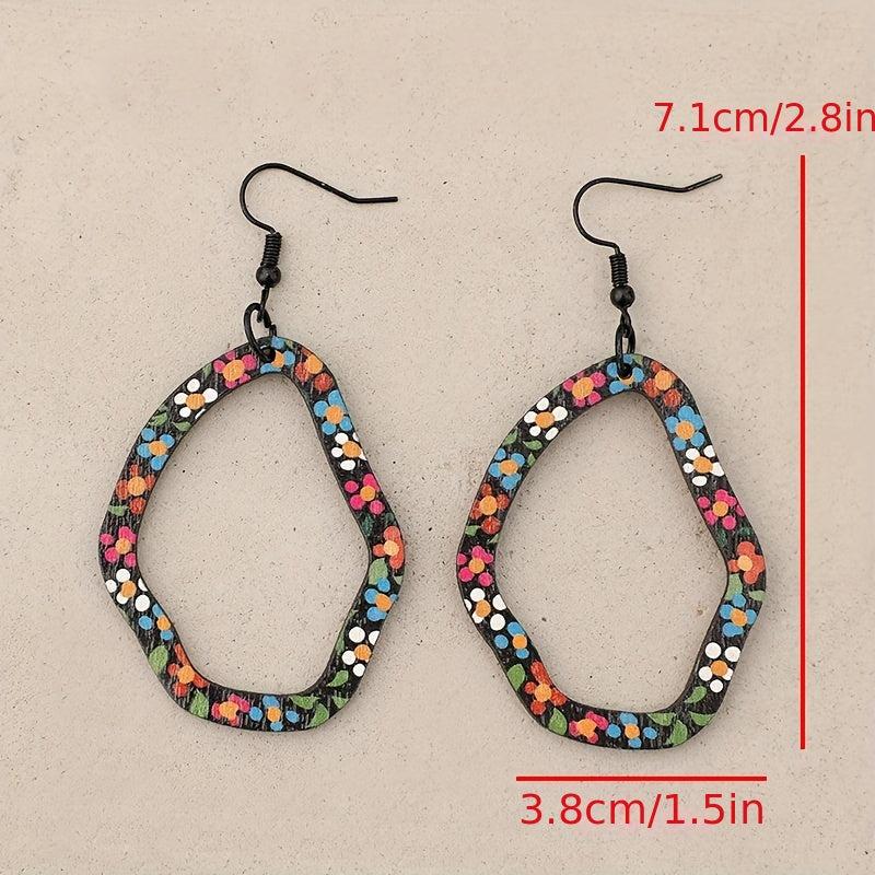 Add a touch of bohemian style with these vintage wooden earrings featuring a geometric hollow design and small floral accents.