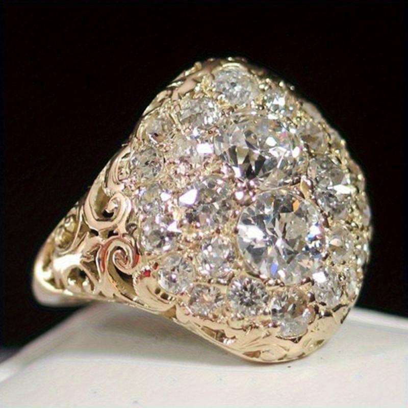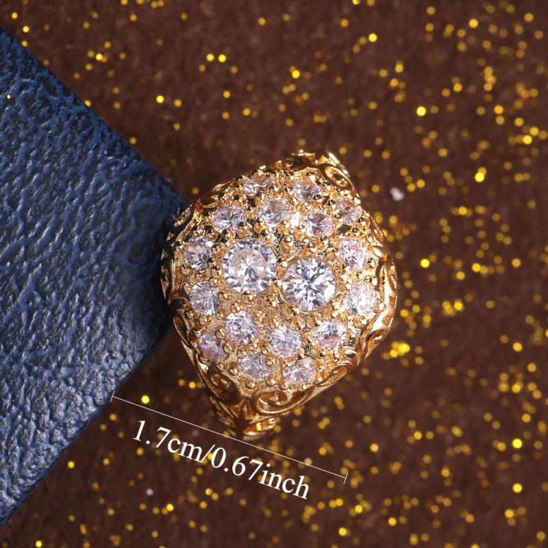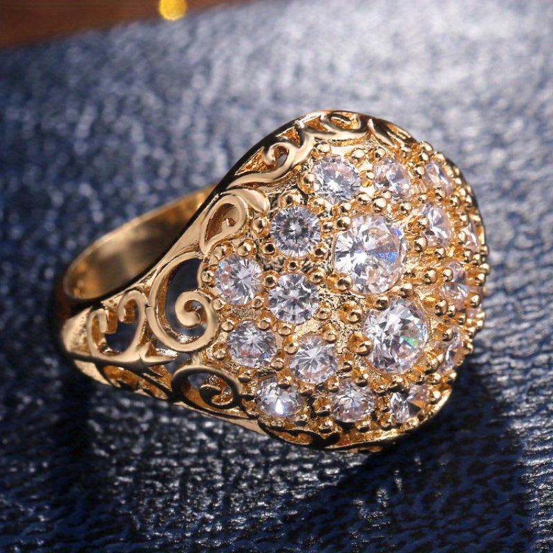 Sparkling cubic zirconia ring with intricate engraving. Golden tone band is perfect for weddings, parties, and cocktails.