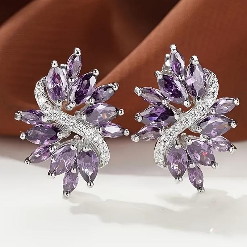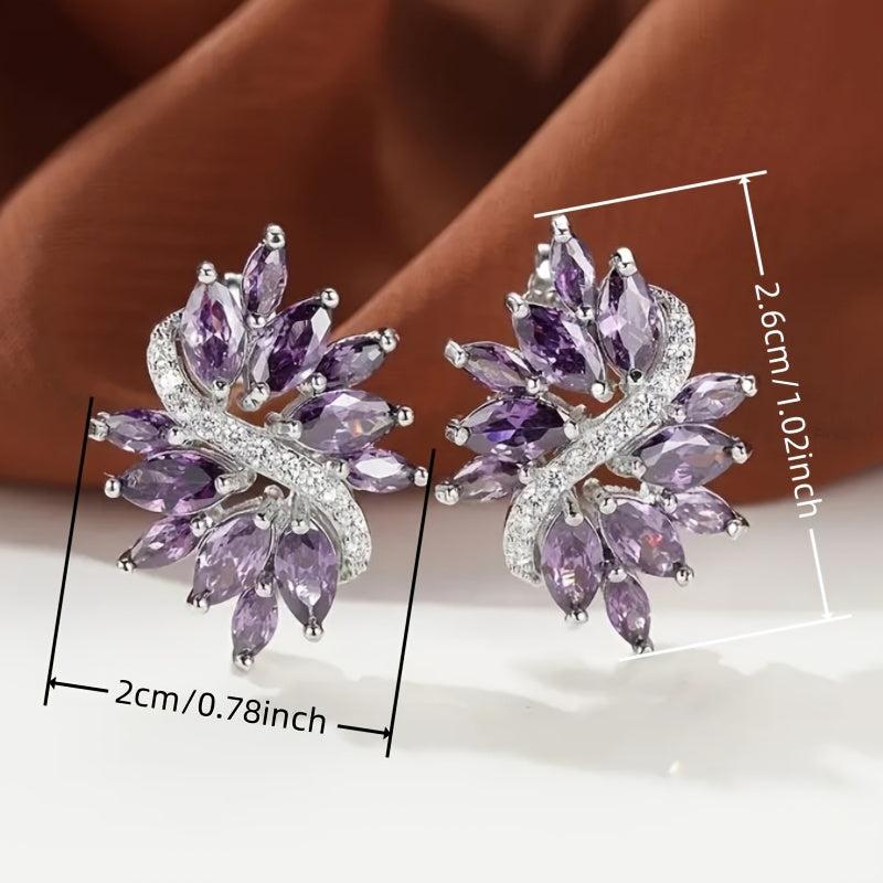 Get these vintage style delicate flower shape stud earrings with purple synthetic zirconia for a charming and elegant look. Perfect for banquets and weddings.
