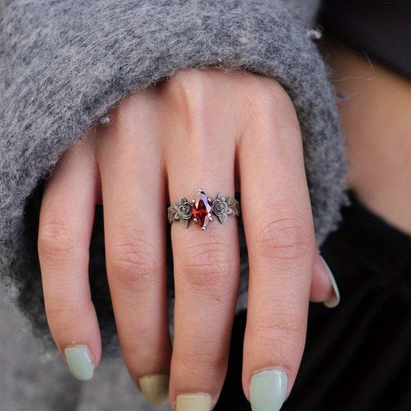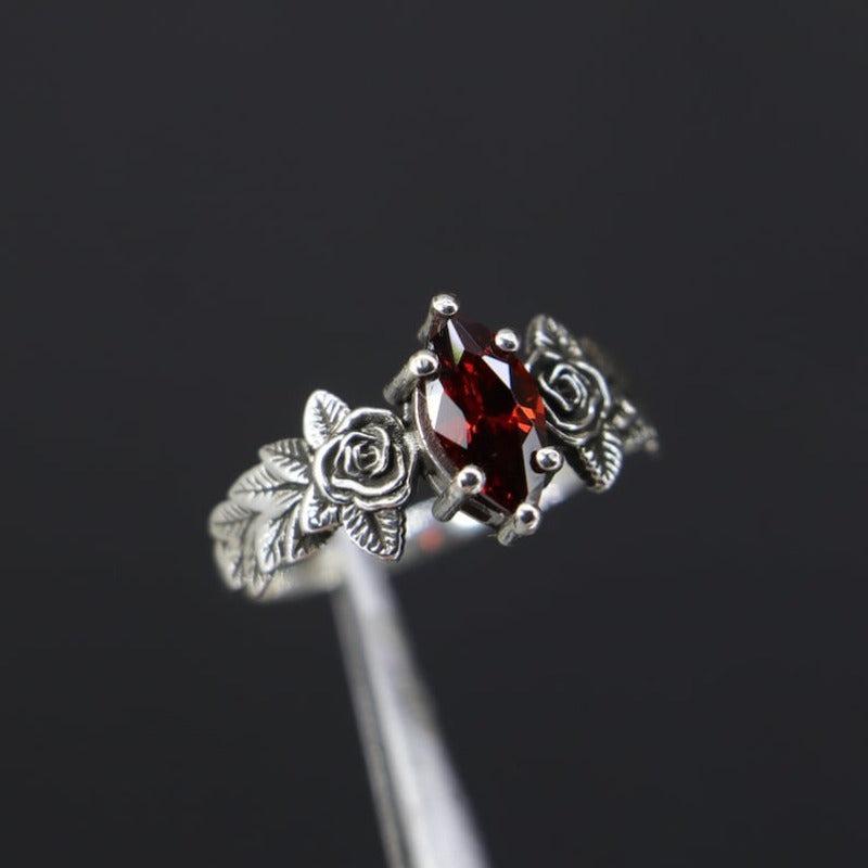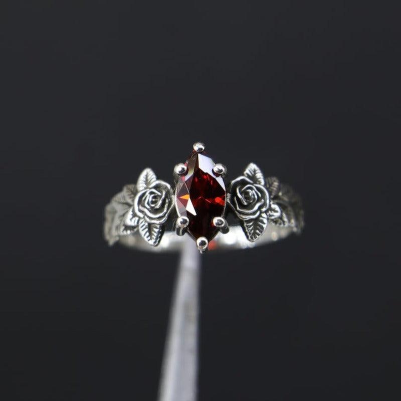 Elegant vintage garnet marquise ring with silvery plated finish. Perfect for engagements or promises, featuring a beautiful rose style design.