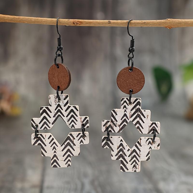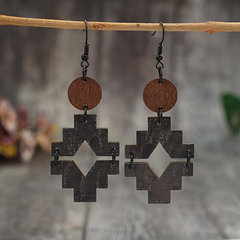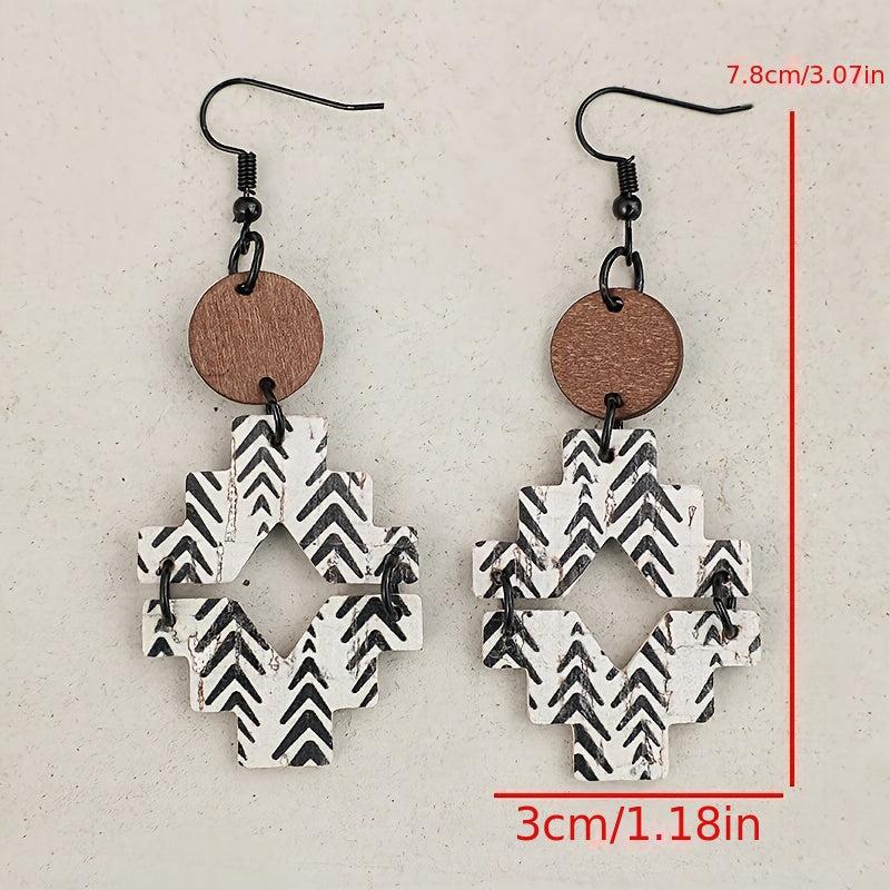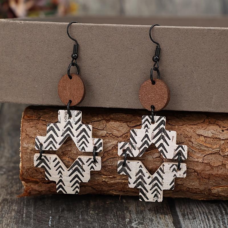 These vintage geometric pattern wooden earrings with iron ear hooks feature a retro distressed Southwestern style design, perfect for daily wear in all seasons.