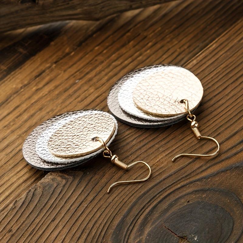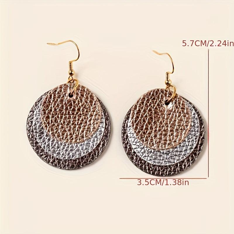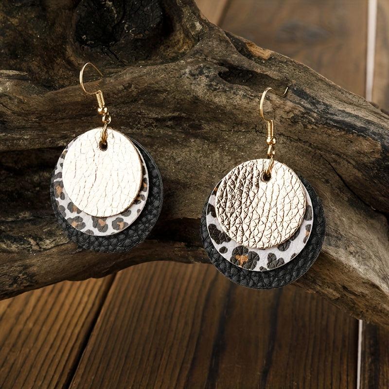 Chic multilayer dangle earrings featuring leopard print faux leather and golden tone accents. Perfect for casual outfits.