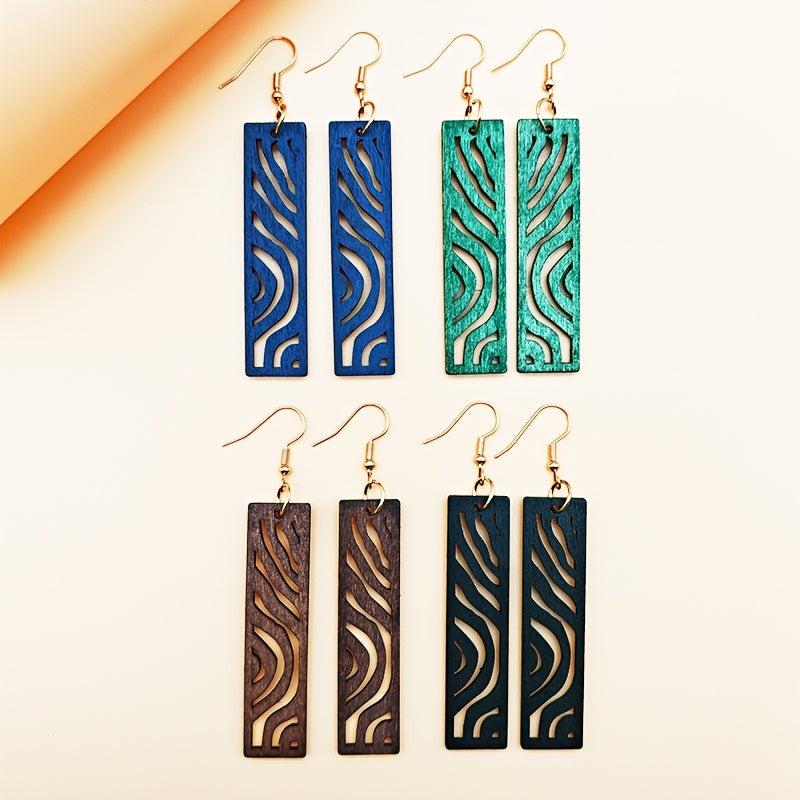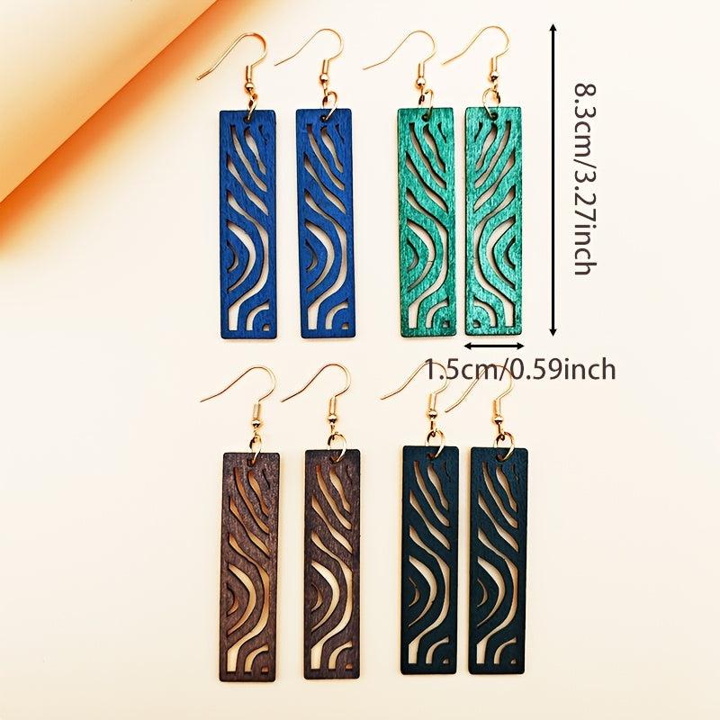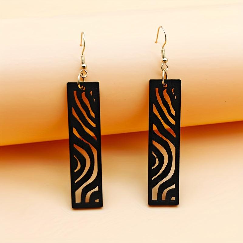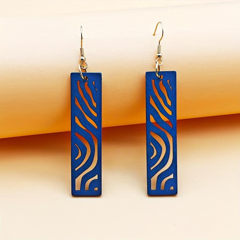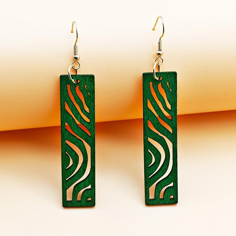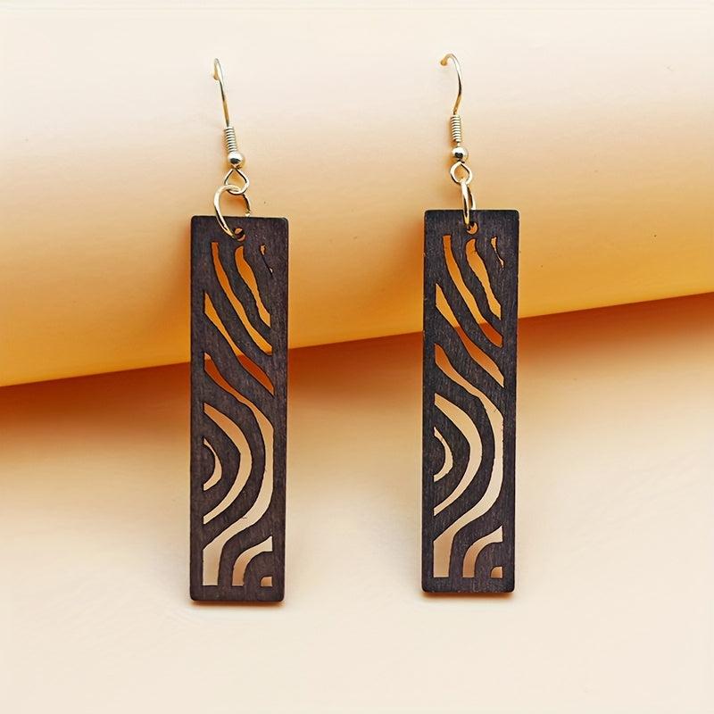 Vintage Style Wooden Drop Earrings Rectangular Pattern Lightweight Iron Ear Need