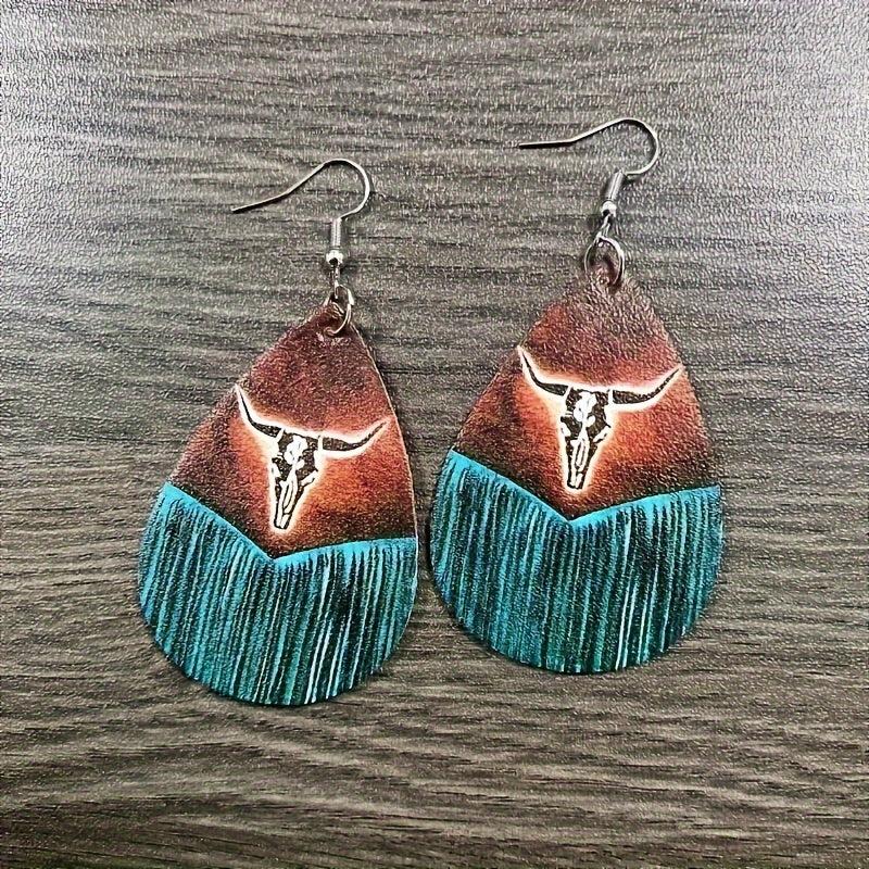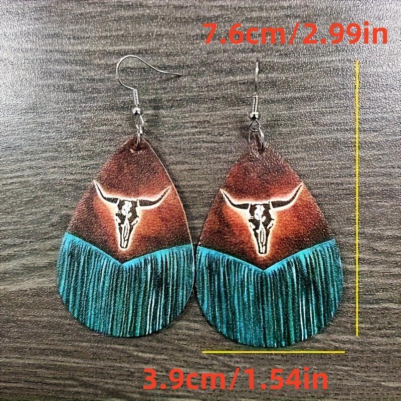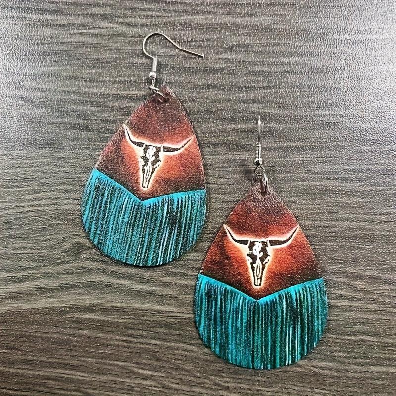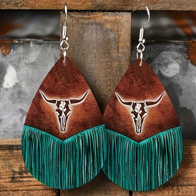 Add a touch of Western flair to your look with these vintage-inspired teardrop earrings featuring a bull head print and turquoise fringe. Perfect for daily wear all year round.